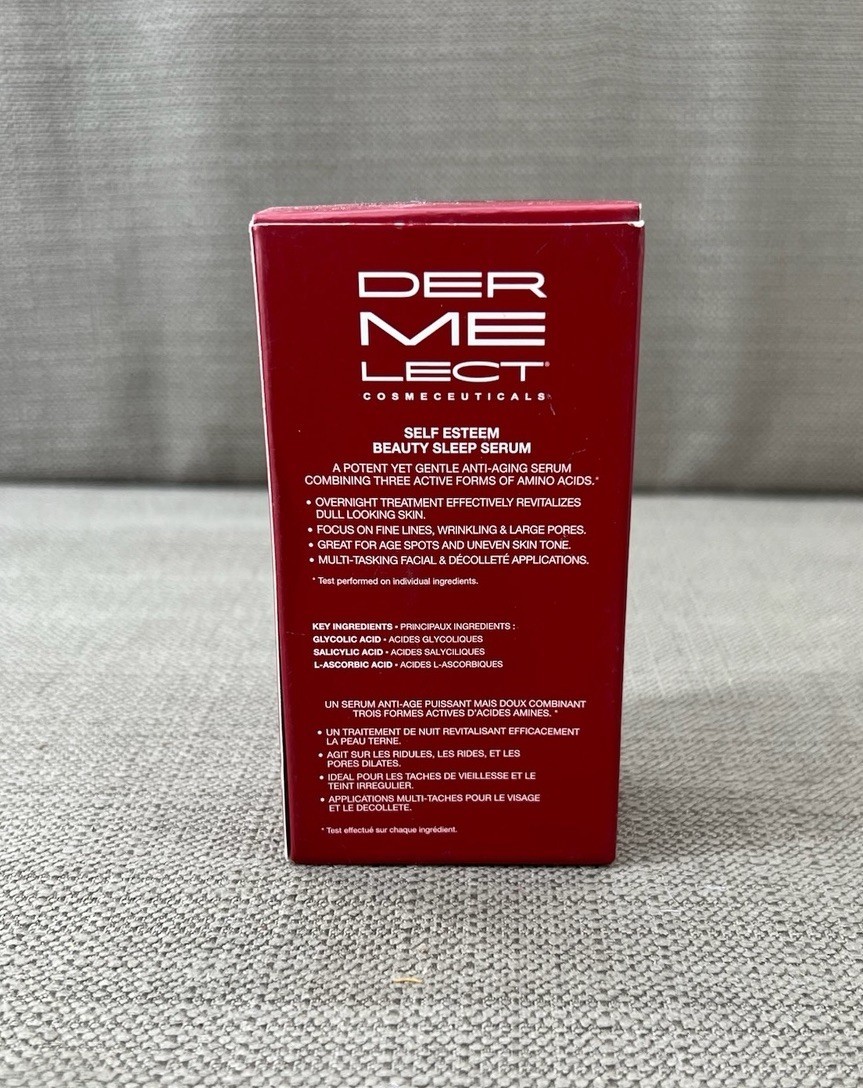 Dermelect Self Esteem Beauty Sleep Serum is a powerful overnight treatment that combines glycolic, salicylic, and l-ascorbic acids to help resurface, brighten, and rejuvenate skin while you sleep. This 1 fl oz (30 ml) bottle is new in box (NIB) and comes with original packaging and insert. Perfect for those seeking smooth, luminous, youthful-looking skin.