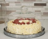 Here is a new dessert cloche with metal base, is round in shape and has a clear glass lid and a gray washed metal base, This measures 10'' dia. x 6''H. Includes a '' tall base. Shown with an 8'' cake. That is not included, Only use with a plate or doily., Nice storage for smaller cakes or pies or cupcakes, bagels, etc And check out my other items i carry