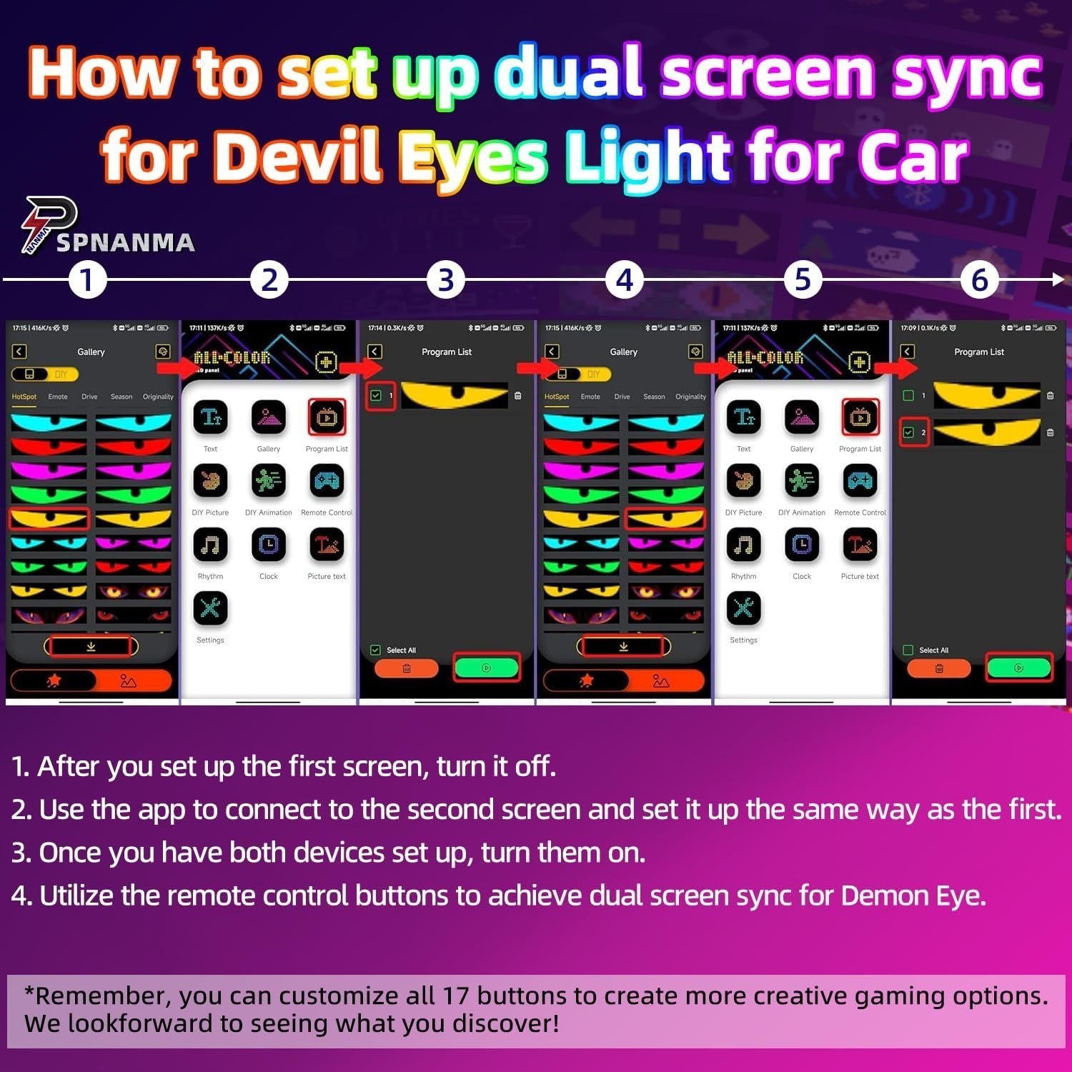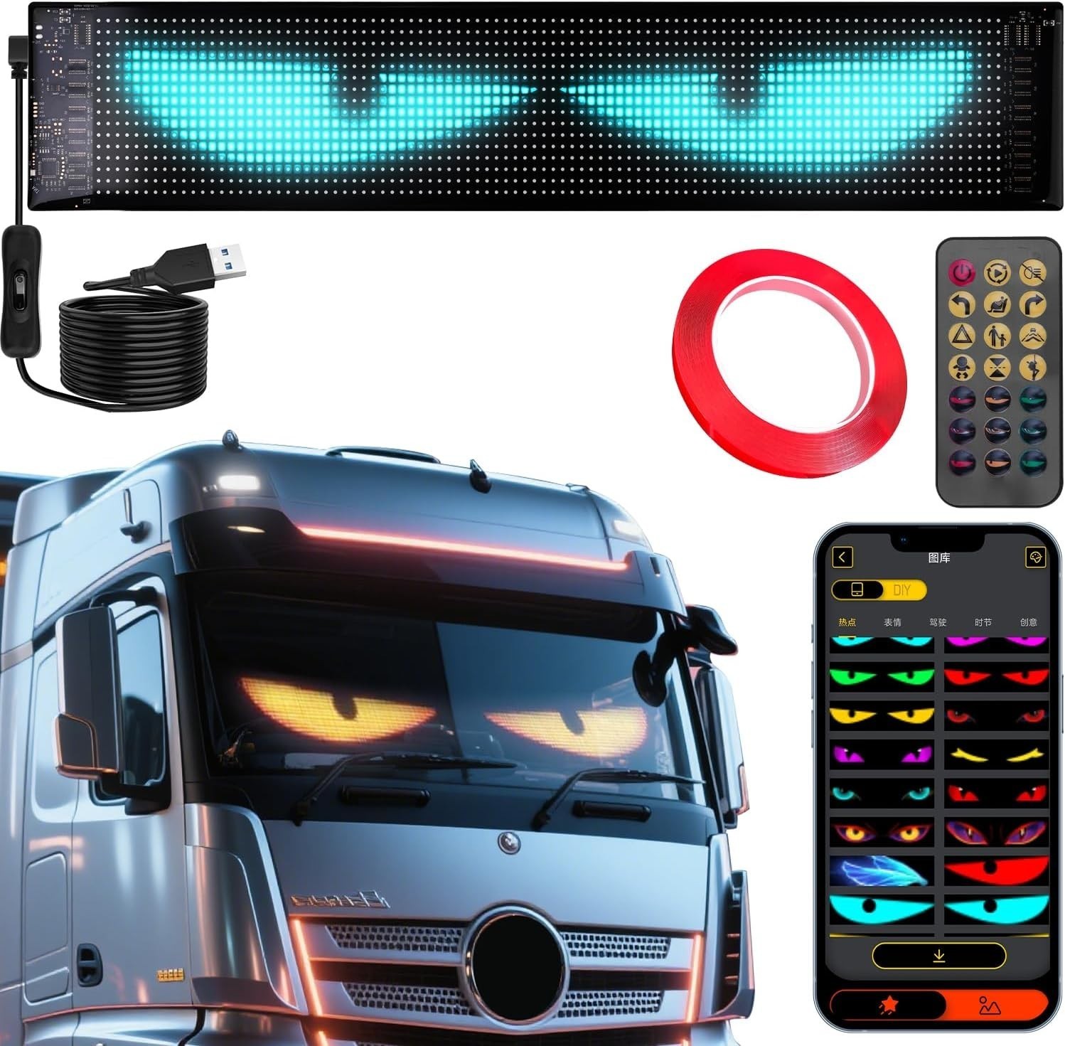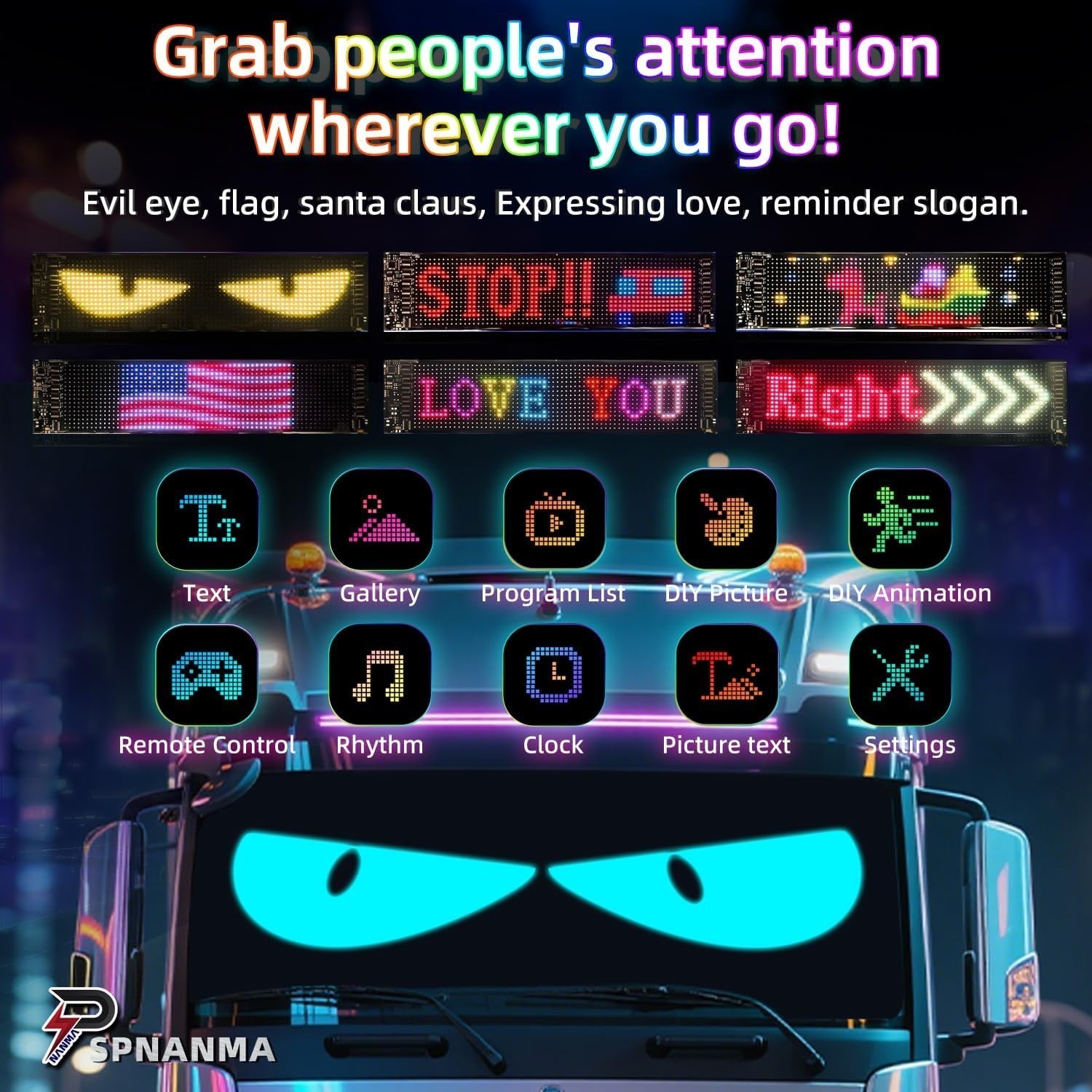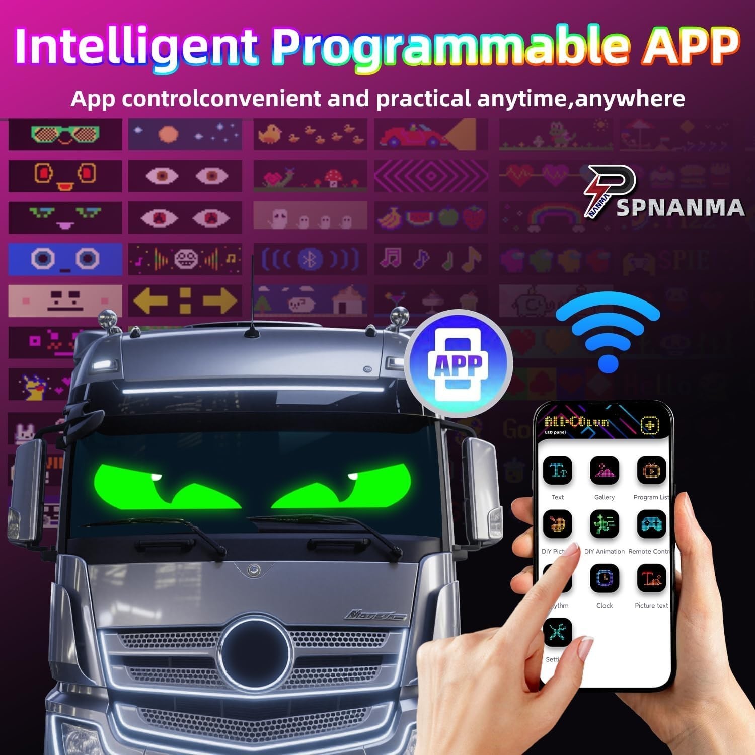 SPNANMA devil eyes light for windshield features a high-density LED matrix panel with 1536 bright RGB lamp beads. Designed with flexible material, it can be bent to fit curved and flat surfaces?perfect for any car or truck windshield. The display remains cool, energy-efficient, and touch-safe even during long drives.