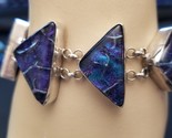 This striking dichroic glass bracelet is set in genuine .925 sterling silver with bold triangular links. The glass shimmers in shades of purple, blue, and teal, catching light beautifully with an iridescent glow. Each piece of dichroic glass is handcrafted, making this bracelet truly one-of-a-kind. A statement accessory that blends artisan design with timeless sterling silver quality.