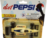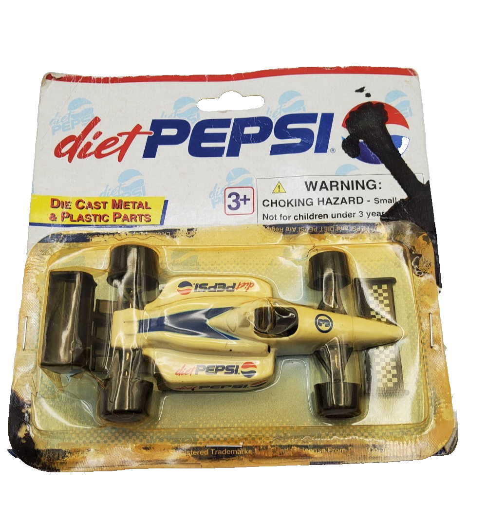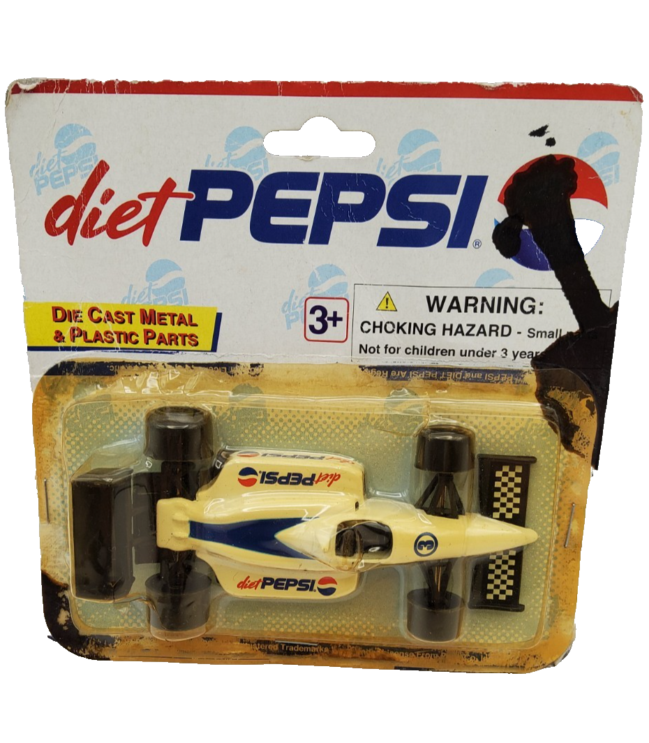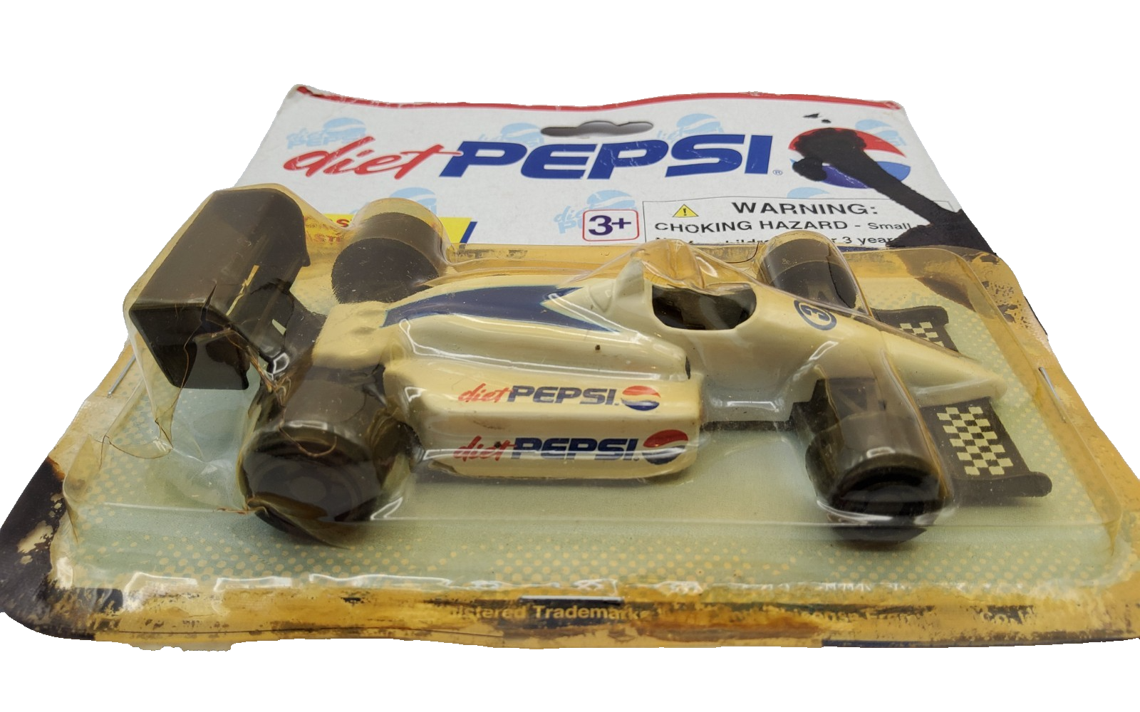 Rare vintage promotional Diet Pepsi Formula 1 style die-cast car with plastic parts, still in its original packaging. Likely from the late 1980s to early 1990s, this collectible was part of a limited promotional run for PepsiCo and is ideal for both advertising memorabilia and die-cast enthusiasts.