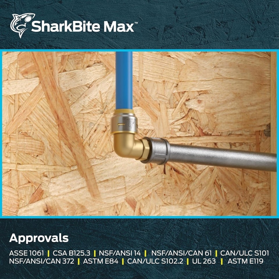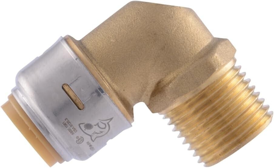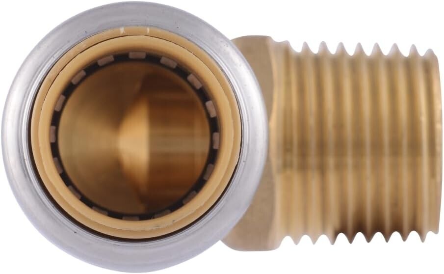 The SharkBite UR280A 90 dishwasher elbow enables fast, reliable connections between a 3/4-inch PEX, copper, CPVC, PE-RT, or HDPE SDR-9 pipe and a 1/2-inch male NPT threaded dishwasher supply line. Made of lead-free DZR brass, this push-to-connect fitting requires no soldering, glue, crimping, or special tools?ideal for tight spaces under sinks or appliances. The integrated stainless steel grab ring and EPDM O-ring ensure a secure, leak-free seal rated for up to 200F and 250 psi (with 2,000 psi burst resistance). Designed specifically for dishwasher hot water hookups, it streamlines installation and reduces errors while maintaining full flow without PEX liner restrictions.