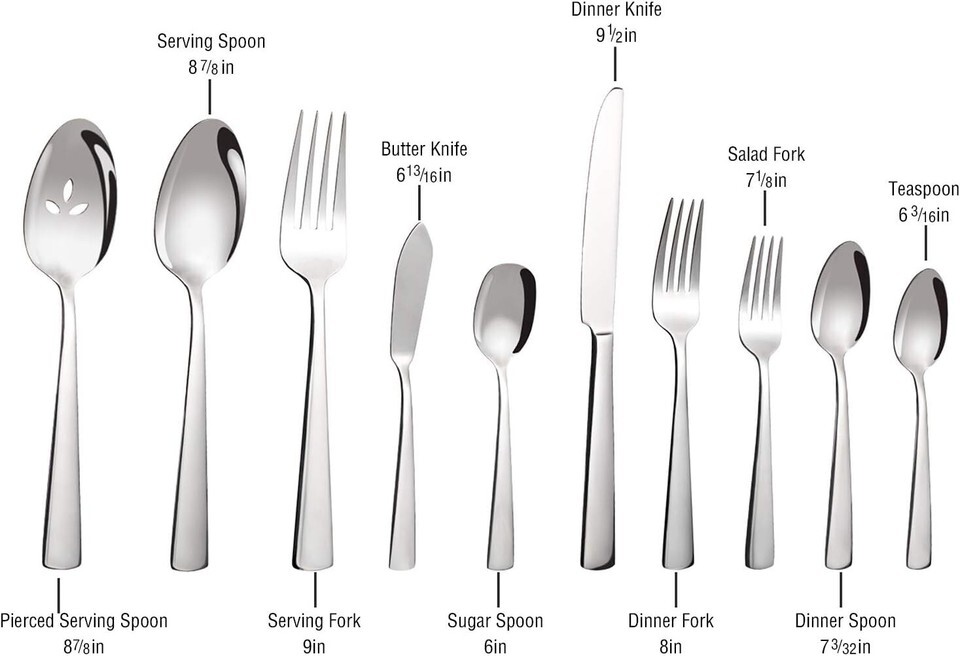 Set Includes: Serving Fork,Serving Set,Serving Spoon,Dinner Fork,Dinner Spoon,Dinner Knife,Teaspoon,Salad Fork,Soup/Cereal Spoon,Sugar Spoon,Butter Knife