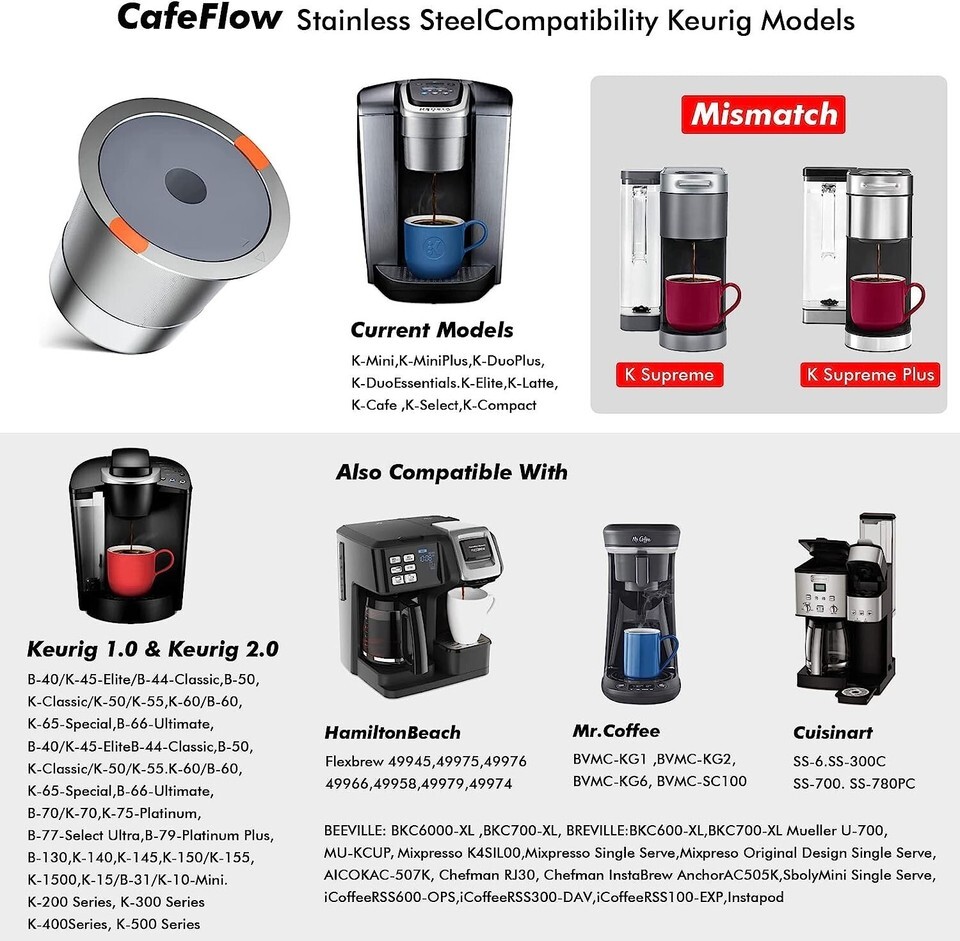 Also suitable for Breville and Mr. Coffee K Cups (see compatibility chart for comprehensive details).