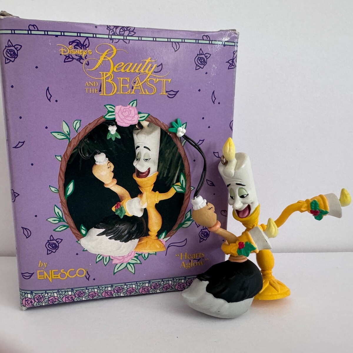 Disney Enesco Lumiere Beauty and the Beast Ornament Hearts Aglow Box with wear secondary to storage Measures approx 3 x 3.5 inches