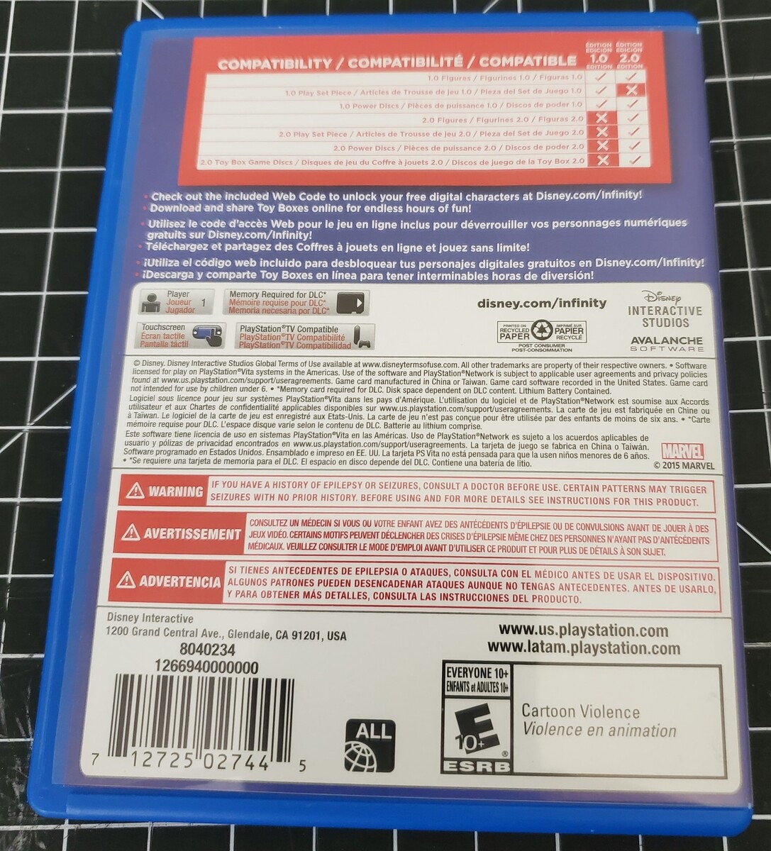 This is for Disney Infinity for the Playstation Vita. This is the NA release. I bought it used and I tested it working. Everything will be included as I bought it, so the booklet is included. The Infinity Base is NOT included. If you have questions about the item, feel free to ask me. I will ship within 3 days of cleared payment and it will be through media mail. RETURN POLICY: All sale are final. Unfortunately, I don't accept returns as of the moment. ABOUT BONANZA: Due to the latest change in fees on this website, my inventory will be on rotation. If there was a different item you were interested in but can't be found, it might still be available. Send me a message to inquire about it. Thank you for taking the time to look at this listing. Bookmark it if you like! Feel free to look at the other listings as well.