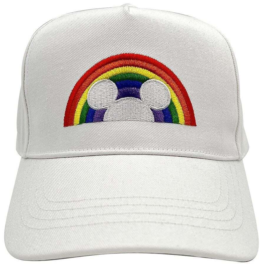 Disney Pride Collection Hat White cap with the 6 colors of the rainbow with a Mickey silhouette inside the rainbow. Rainbow in red, orange, yellow, green, blue and purple. Hat comes with an adjustable velcro strap.