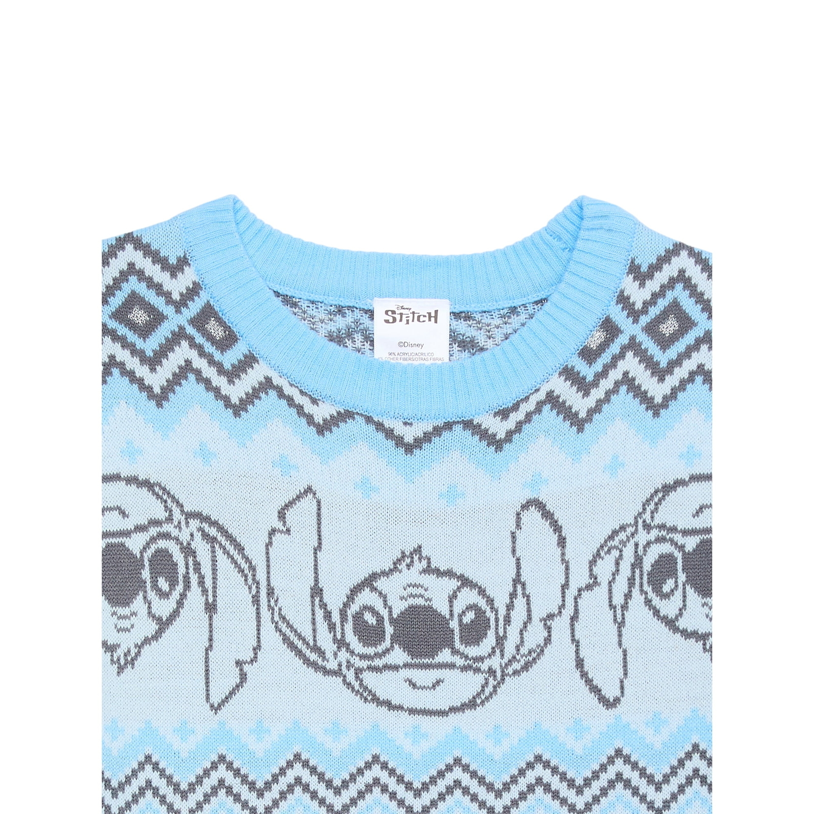 Disney Stitch Girls Metallic Lurex Holiday Sweater, Dutch Blue Size L (10-12) Material: 100% Acrylic Care: Machine washable Fit: Relaxed Neckline: Crewneck Closure: Pullover style Sleeves: Long sleeves Pockets: None Features: Jacquard knit with allover print Disney, All Rights Reserved Disney Stitch Crewneck Sweater for Girls