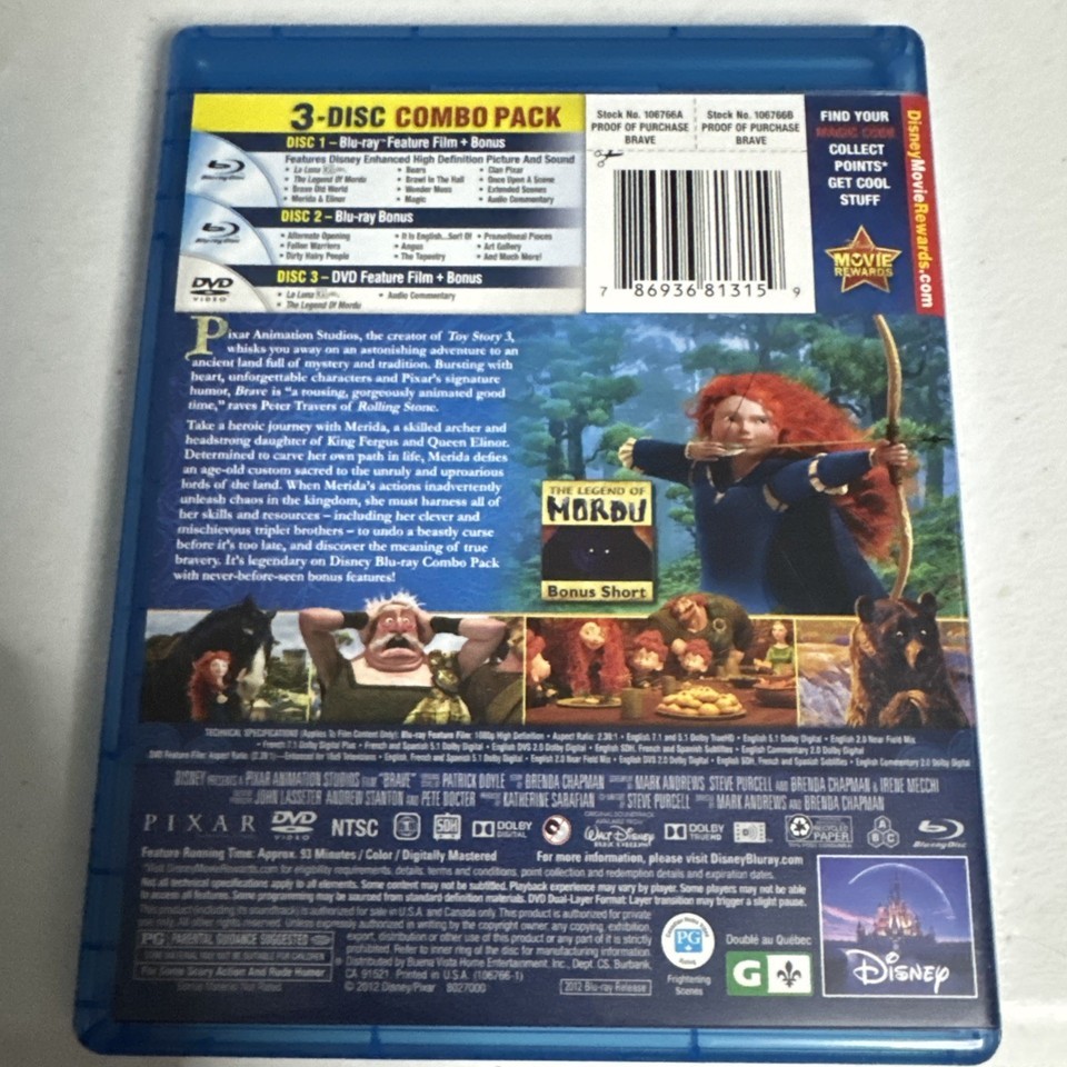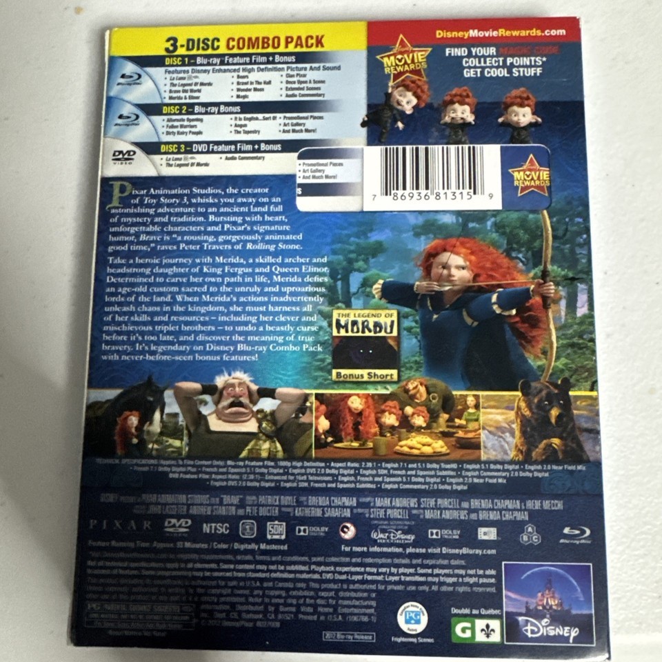 - Disney's Brave (Blu-ray/DVD 3-Disc set, 2012) Disney PIXAR Animation