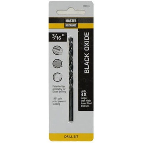 Master Mechanic, 3/16" x 3-1/2", high speed steel, BLACK oxide drill bit, 135 split point, jobber length, straight shank, 135 point angle with 4 cutting edges which eliminate walking provide fast penetration, BLACK oxide tempering treatment reduces Frictional resistance improves chip flow, recommended for wood, plastic, Wallboard, plywood soft metals, aluminum, brass bronze, for occasional use in stainless steel other hard metals, Carded.