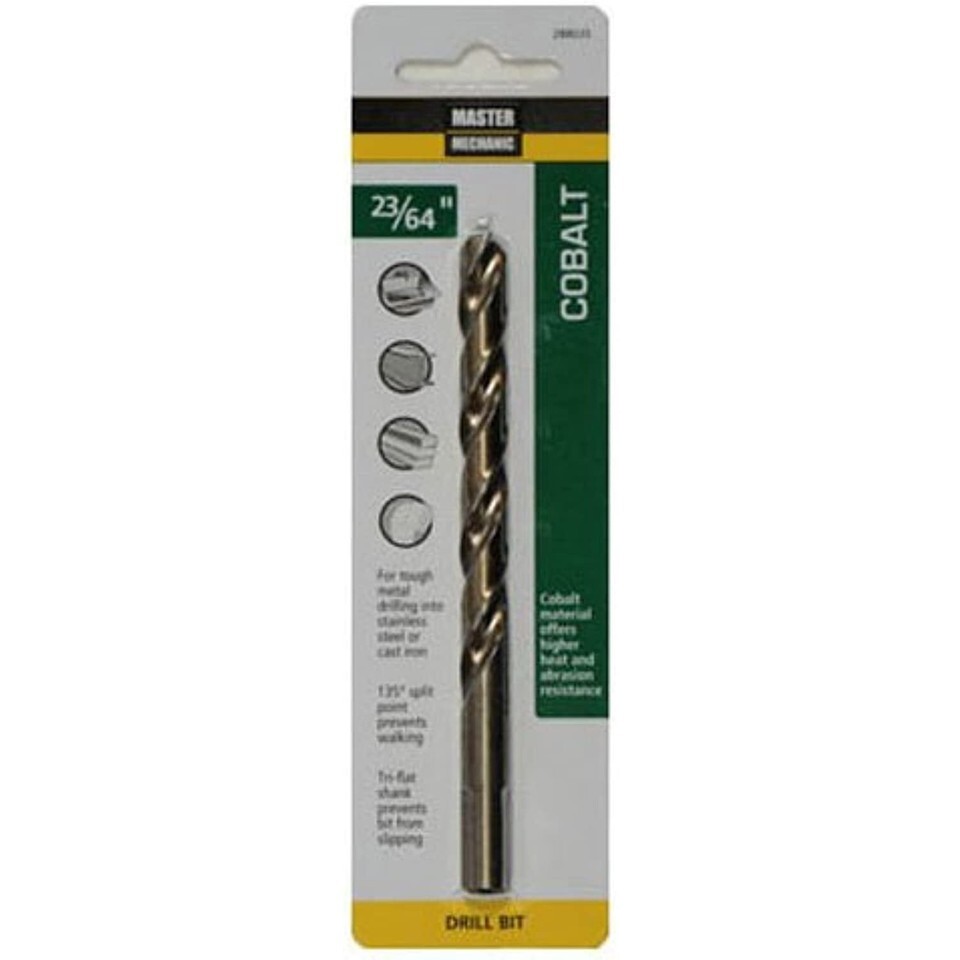 Master Mechanic, 23/64" x 4-7/8", high speed steel with cobalt drill bit, 135 split point, jobber length, straight shank, 135 split point design with 4 cutting edges allows quick penetration eliminates walking, 8 percent cobalt content provides heat resistance delivers maximum cutting efficiency at temperatures in excess of 1000 degree Fahrenheit, recommended for drilling in hard metals such as heat treated steel, stainless steel, chrome, manganese steel Plus titanium Armor plate, Carded.