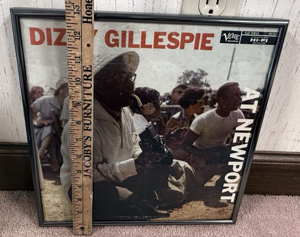 Up for sale is a classic vinyl record sleeve of Dizzy Gillespie's live performance at Newport, featuring the renowned saxophone player. This record cover is in excellent condition The sleeve is a paper sleeve. This original sleeve and professional framed with metal framing. 12x13"