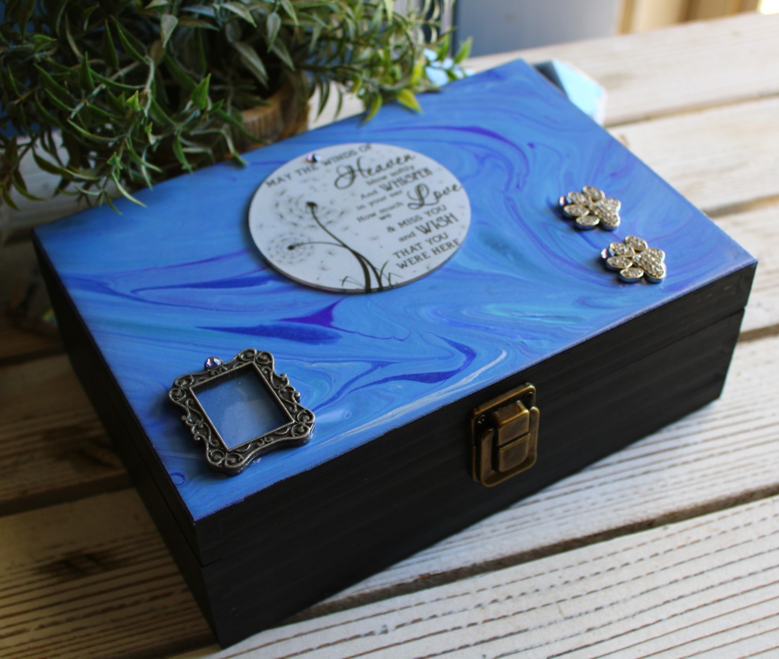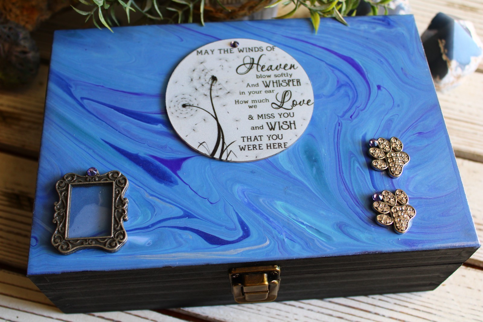 This is a Memorial Urn with a Photo Frame to include of your beloved Dog. It measures 8" x 5" x3". I created it using the acrylic pour method, so no two will ever be alike. This Urn box will accommodate the remains for a pet up to 80 pounds. It has one photo frames to add a photo of your loved one.