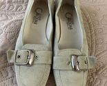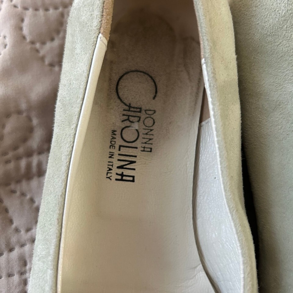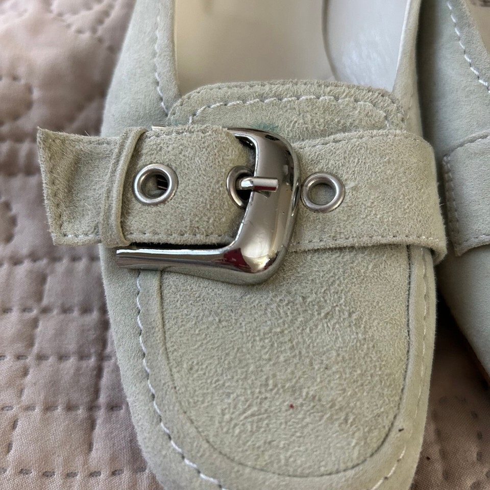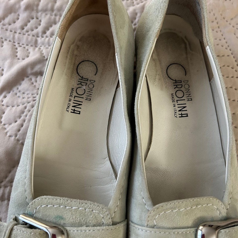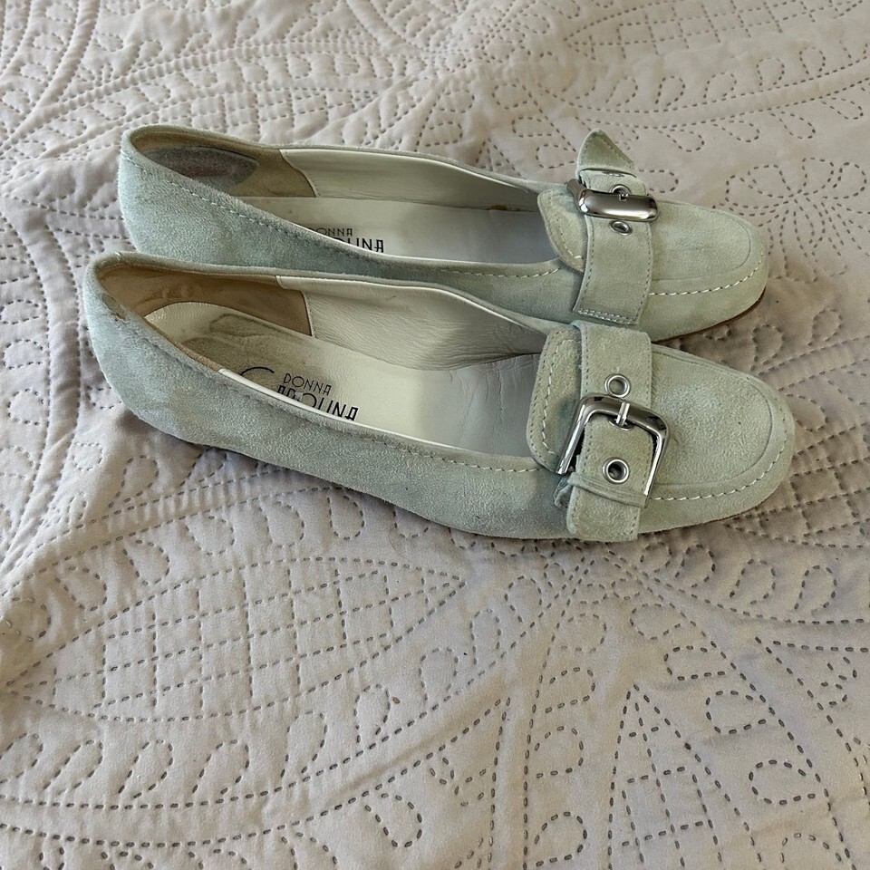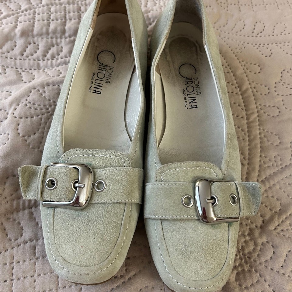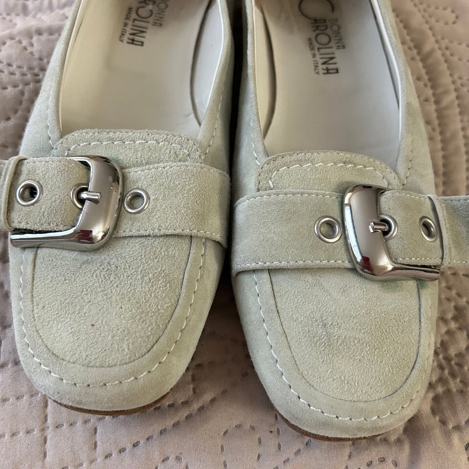 These Donna Carolina green faux suede buckle shoes in women's size 38/7 1/2 offer a stylish and comfortable option for everyday wear. Made in Italy, these shoes feature a soft faux suede exterior in a lovely light green hue, accented with decorative silver-tone buckles on the vamp. The interior shows some signs of wear, consistent with being a pre-owned item, but overall they are in good condition. The soles also show minimal wear, indicating they have been gently used. Perfect for adding a touch of casual elegance to any outfit.
