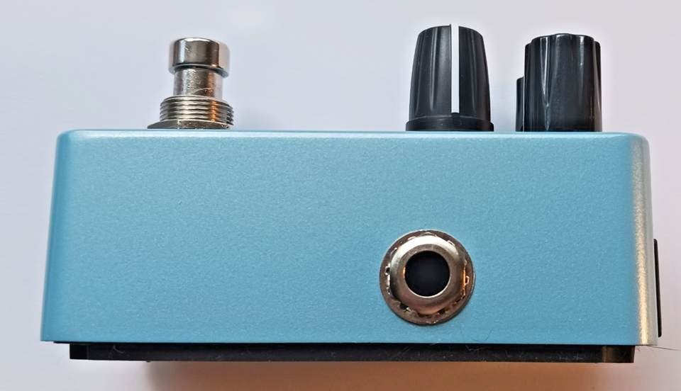 This pedal has standard 1/4" input and output, adapter input, and 3 Dials that control Level (the Mix), Depth, and Rate. It has a nice blue colored metal case and a true bypass switch. This one's extra special due to 2 nice Davies type 1900 style knobs, and one larger, rubber-coated knob for the Rate, all black in color.