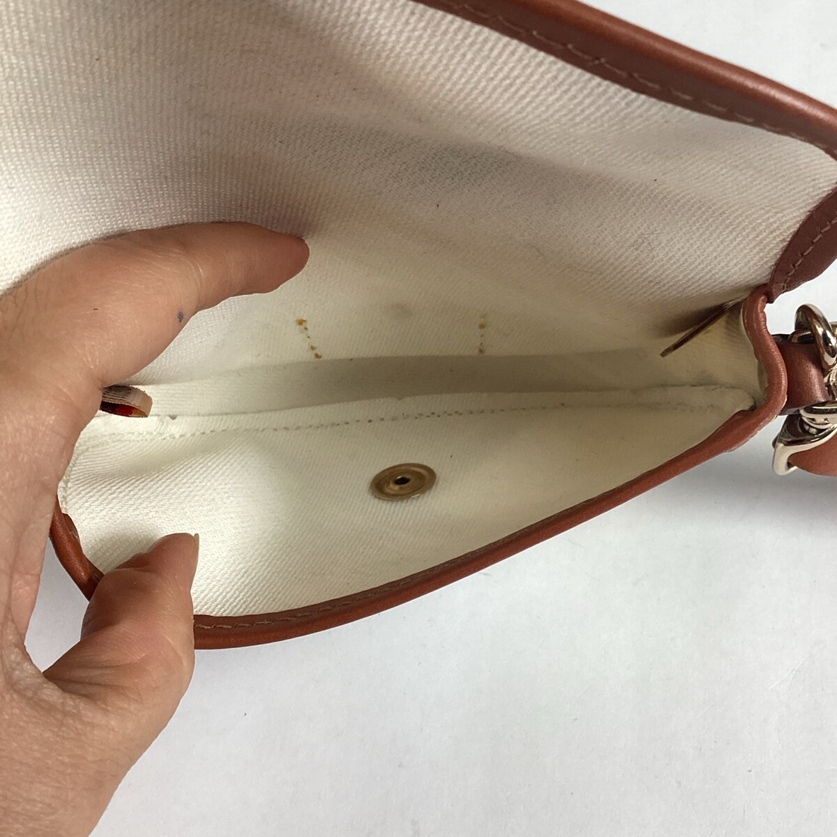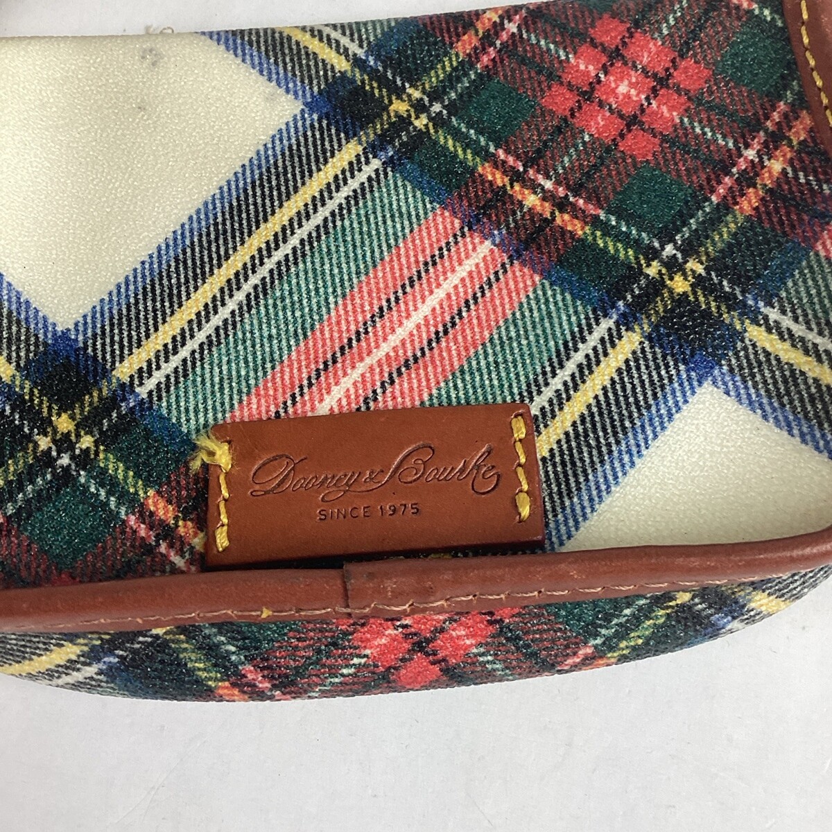 Dooney Bourke 6.5? Plaid Colored Zip Keychain Wallet Coin Purse. In good condition overall. There are a few light stains on both sides and the interior. This measures 6.5x4.5?. Assembled in Mexico.