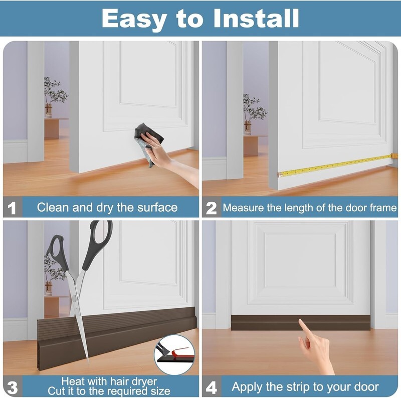 Easy to Install - No Tools Needed: 1. Please make sure the door surface is clean and dry before installing the door seal strip bottom. 2. Cut the seal strip to fit your door size. 3. Peel off the adhesive backing and firmly stick it to the door bottom. 4. After installation, avoid opening or closing the door frequently for 24 hours. (Note: In cold weather, warm the adhesive with a hair dryer for 2 minutes before applying for better adhesion. )