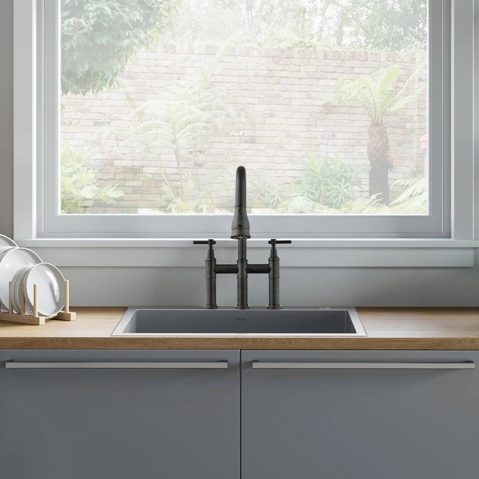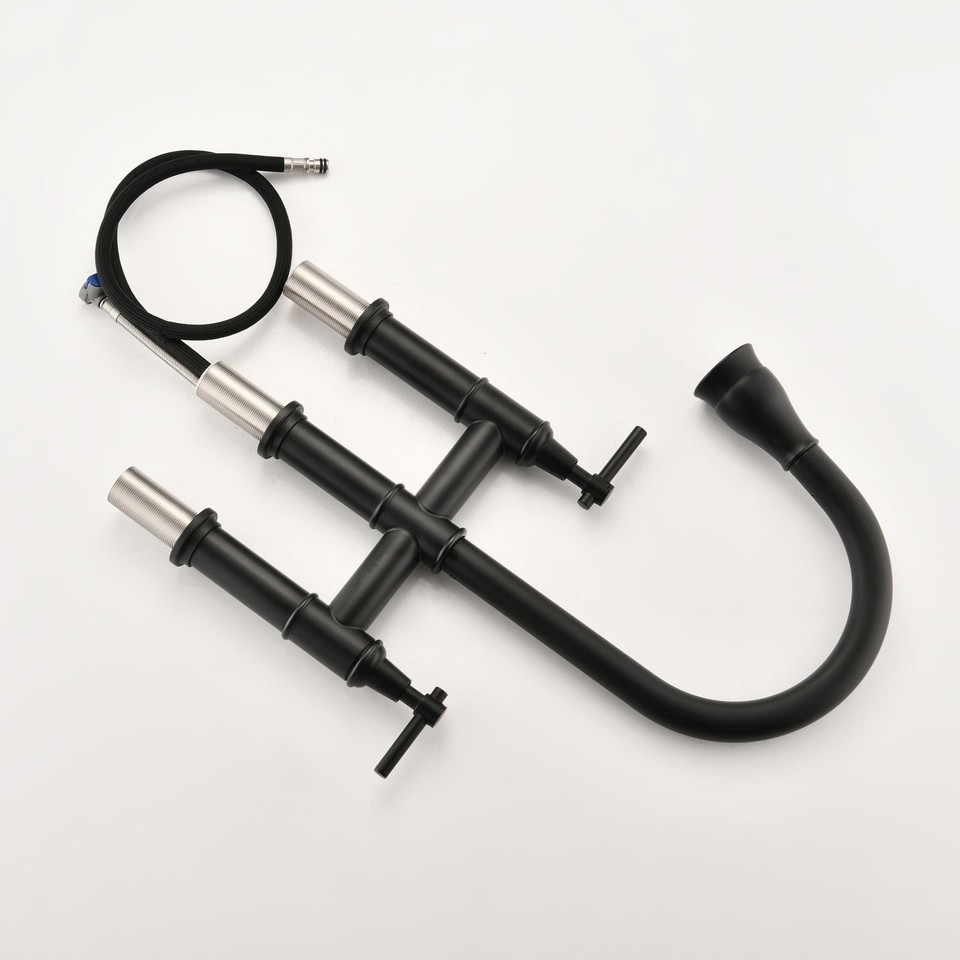This faucet combines the pull-down faucet with the bridge faucet. Its elegant curves and decorative details perfectly balance the classical and modern styles, creating a transitional look that complements any kitchen and adds a fashionable and novel look to your home.