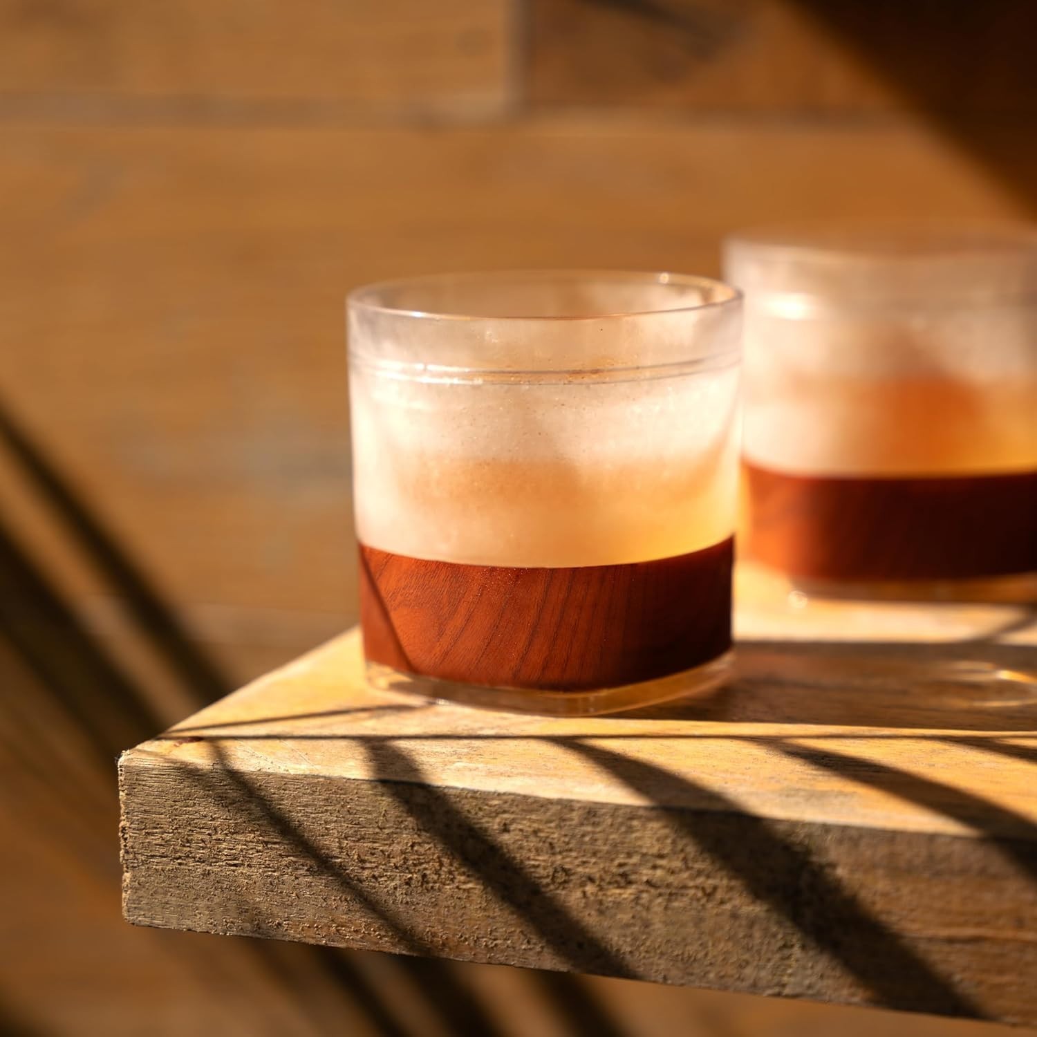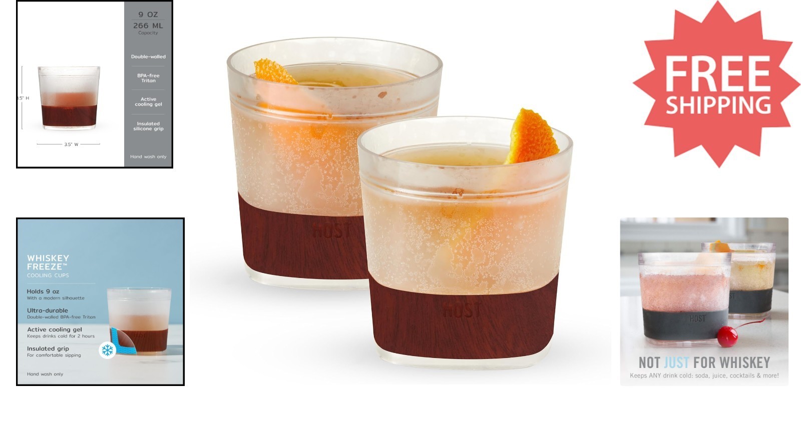 Elevate your whiskey experience with the Host Whiskey Freeze cocktail glasses, expertly designed to keep your bourbon and scotch perfectly chilled without dilution. Crafted with double-walled insulation filled with proprietary cooling gel, these tumblers maintain ideal temperature for up to two hours. The BPA-free plastic construction paired with a comfortable silicone band ensures durability and easy handling, whether at home or outdoors. Perfect for neat spirits or cocktails like Old Fashioned, Manhattan, or highball, these glasses offer an uncompromised tasting experience. An innovative gift for whiskey aficionados or a camping essential. Set of 2, 9 oz. cups with a stylish wood pattern band. Hand wash only.