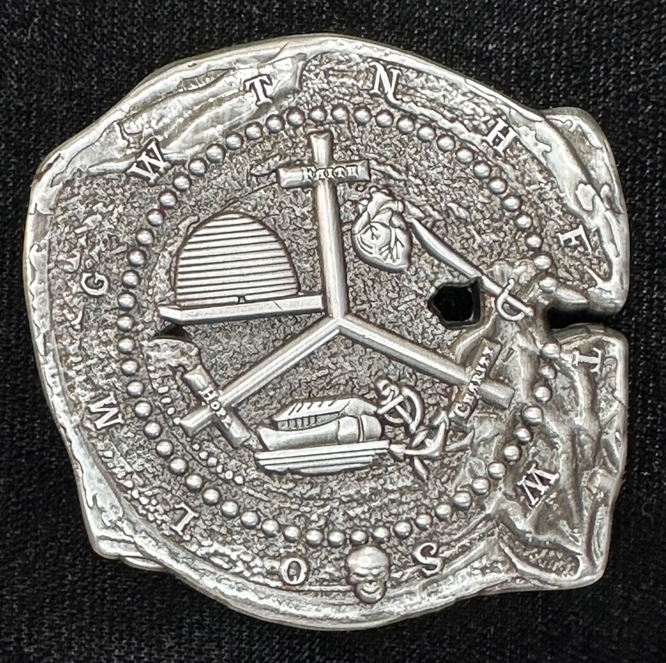 Doubloon Pirate Challenge coin with Freemason Masonic symbols, Antique silver