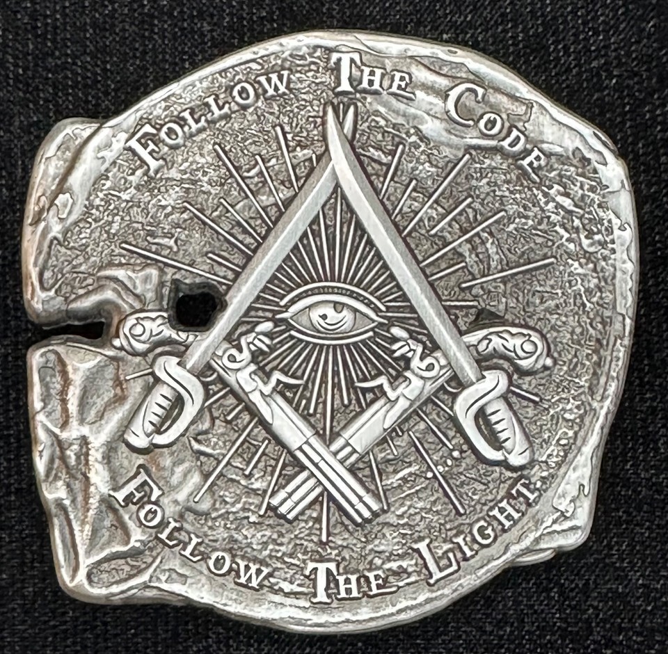 The front has a pair of cutlasses and a pair of flintlock pistols arranged into the Square and Compasses orientation, with the All-Seeing Eye in the middle, with the words "Follow the Code" around the top and the words "Follow the Light" around the bottom.