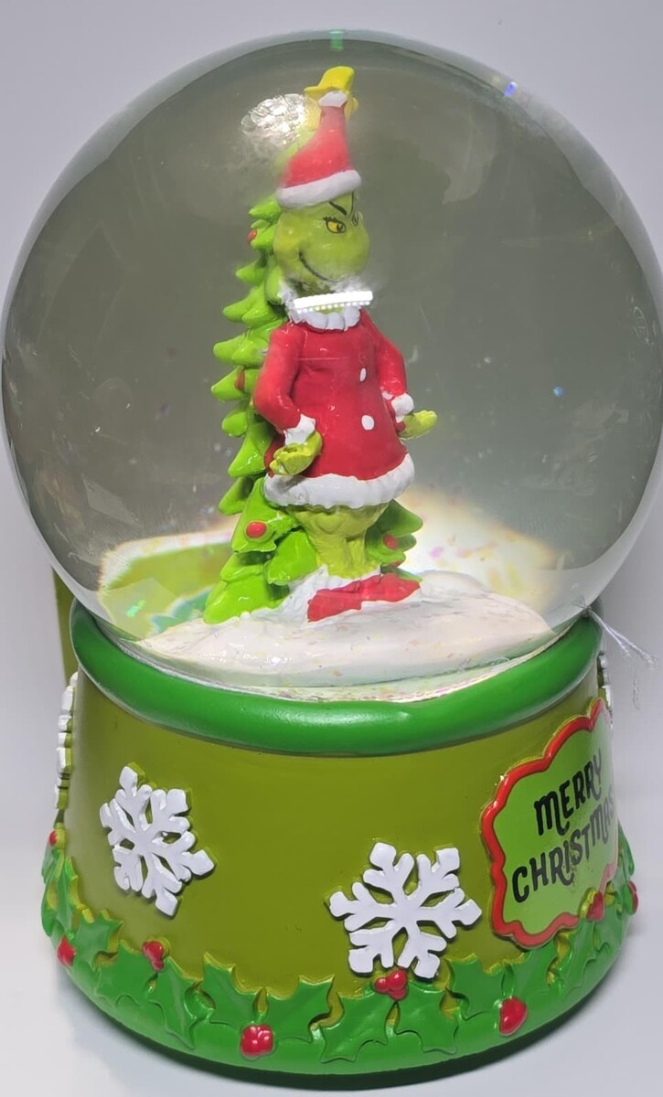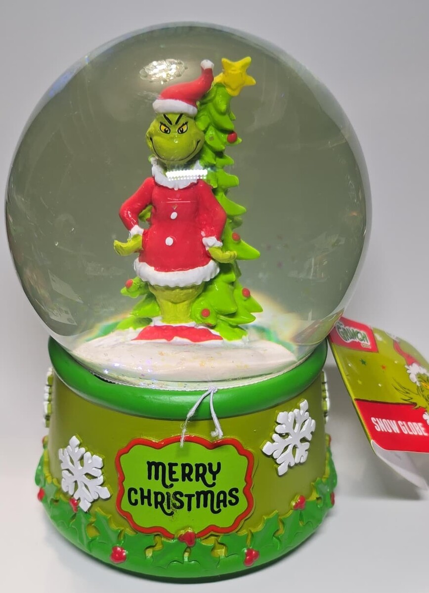 Dr. Seuss' The Grinch Merry Grinchmas Snow Globe Create a very merry holiday display with this Merry Grinchmas Snow Globe! This festive snow globe features a resin base that is decorated with stars and snowflakes, and has the phrase "Merry Christmas" on the front in retro font. In the globe is a small little statue of The Grinch in front of a Christmas Tree. When you twist the lever on the bottom, a cheerful rendition of "Jingle All The Way" plays. Pair this with other Grinch-themed decor for a whimsical arrangement. Dimensions: 5.75" H x 4" W x 4" D Material: Glass, Resin Metal Color: Clear, Red, Green Iridescent Care Safety: Do Not Place By Windows Or Direct Sunlight; Heat May Cause Air Bubbles And Water To Cloud Age Grade: 8+ Quantity: 1
