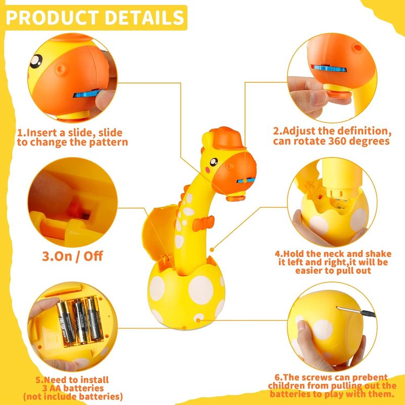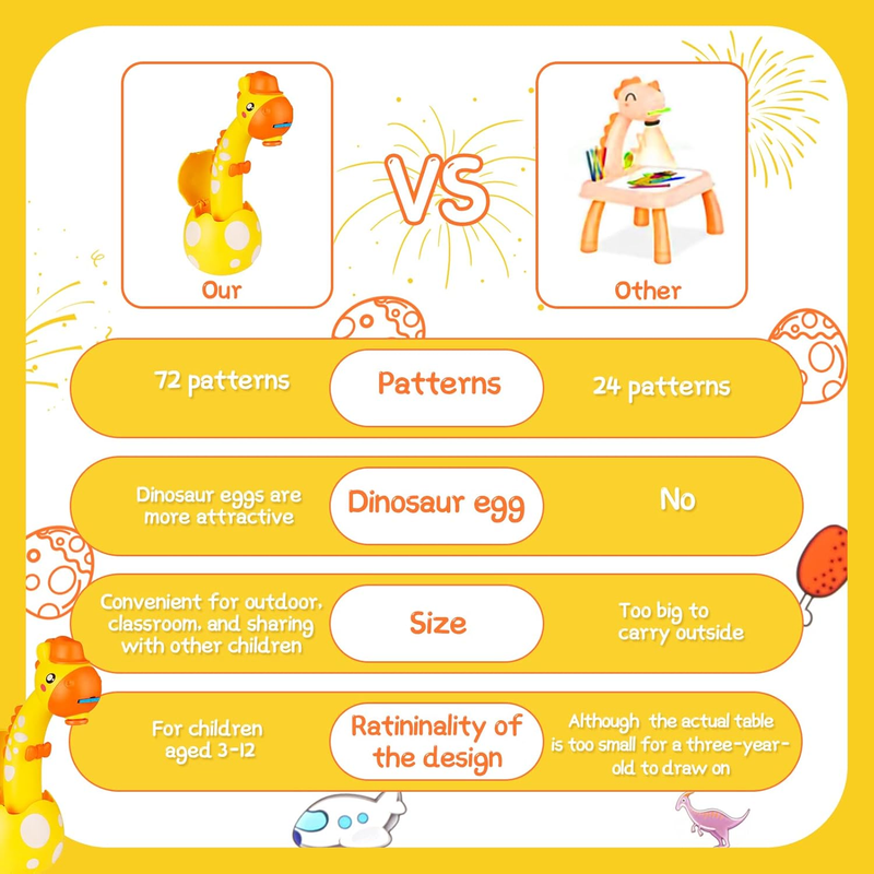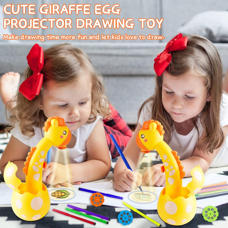 ?Drawing Kit 3-7?This kids drawing projector set contains the drawing machine x 1, the drawing book x 1, the drawing color pens x 12, Projection Slides x 9 and the erasable board x 1. Giraffe cute design makes this toy a nice gift to kids. The toy features the bright colors to be great for drawing.