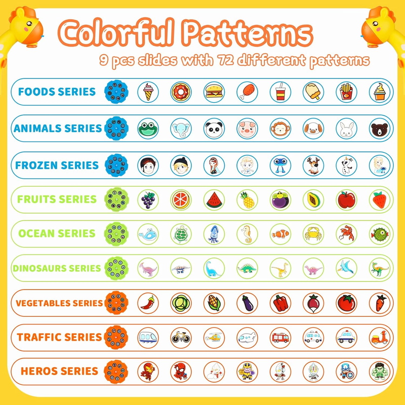 Trace and draw projector toy come with 9 slides, (Fruits, Vegetables, Foods, Animals, Heros, Frozen,Dinosaurs, Ocean, Traffic), 72 different patterns. kids can switch as they like and immersed in them, learn to draw, recognize patterns and feel colors, improve your kids? creativity and imagination, exercise hand-eye coordination color perception ability.