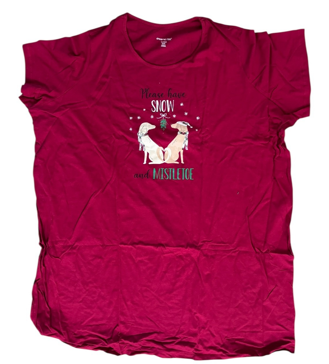 Dreams Co Christmas Red Please Have Snow and Mistletoe Nightgown Women's Size 5x/6x NEW Made of 100% Cotton Underarm to underarm measures 37 inches across Underarm to bottom of nightgown measures 34 inches Back of collar to bottom of nightgown measures 44 inches