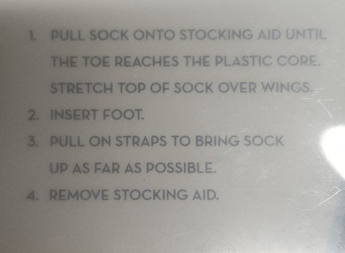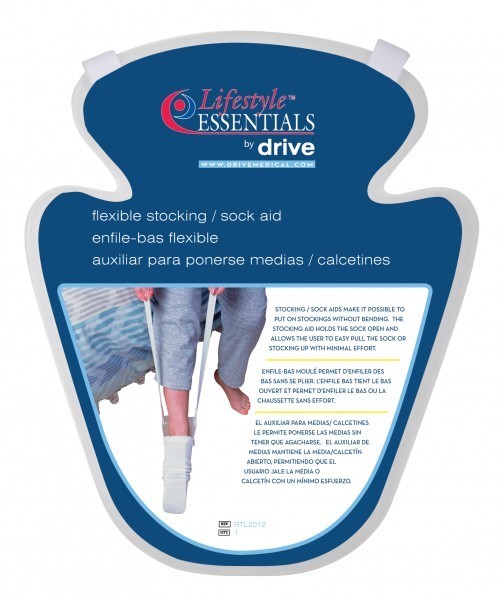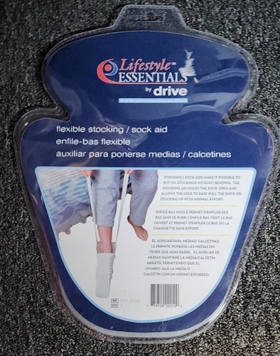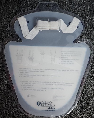 This sale is for one (1) Drive ~ Lifestyle Essentials ~ Polyethylene Flexible Sock and Stocking Aid (If bending over is difficult ~ putting on shoes and socks can become quite a struggle Stocking Aid is a curved plastic form that?s wider than a person?s foot and has flexible handles attached To use it ~ you place the sock on the form ~ which keeps the sock open and ready for your foot Hold onto the handles ~ lower the Stocking Aid to the floor ~ and simply slip your foot in ~ no bending or tugging required Once your foot is all the way into the sock ~ pull on the handles and remove the Stocking Aid ~ leaving your foot inside the sock) A soft plastic stocking aid that can be easily folded or rolled to fit inside a sock Its curved cutouts on the sides hold the sock while it is being pulled up the leg A long webbing strap allows the user to pull the strap without bending over Latex free Item is new in original packaging Please view photos for a good description of this item Thank you!