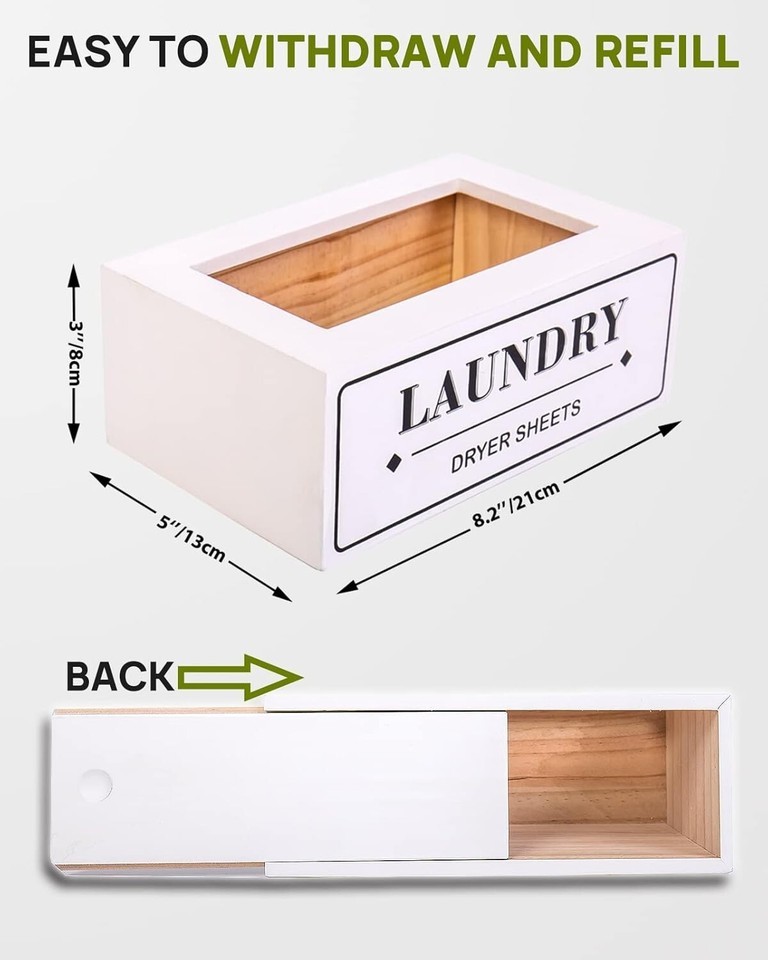 Farmhouse Dryer Sheet Holder: A great way to hide the ugly dryer sheet box. The white finish of the box adds a warm farmhouse look to the laundry room. It looks clear,simple modern to match laundry room decor. Store your dryer sheets in this laundry dryer sheet holder