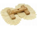 Made of white Tampico fibers set in clear lacquered hardwood block. Brush is double-wide. Has a standard threaded hole in center for use with any standard broom handle..