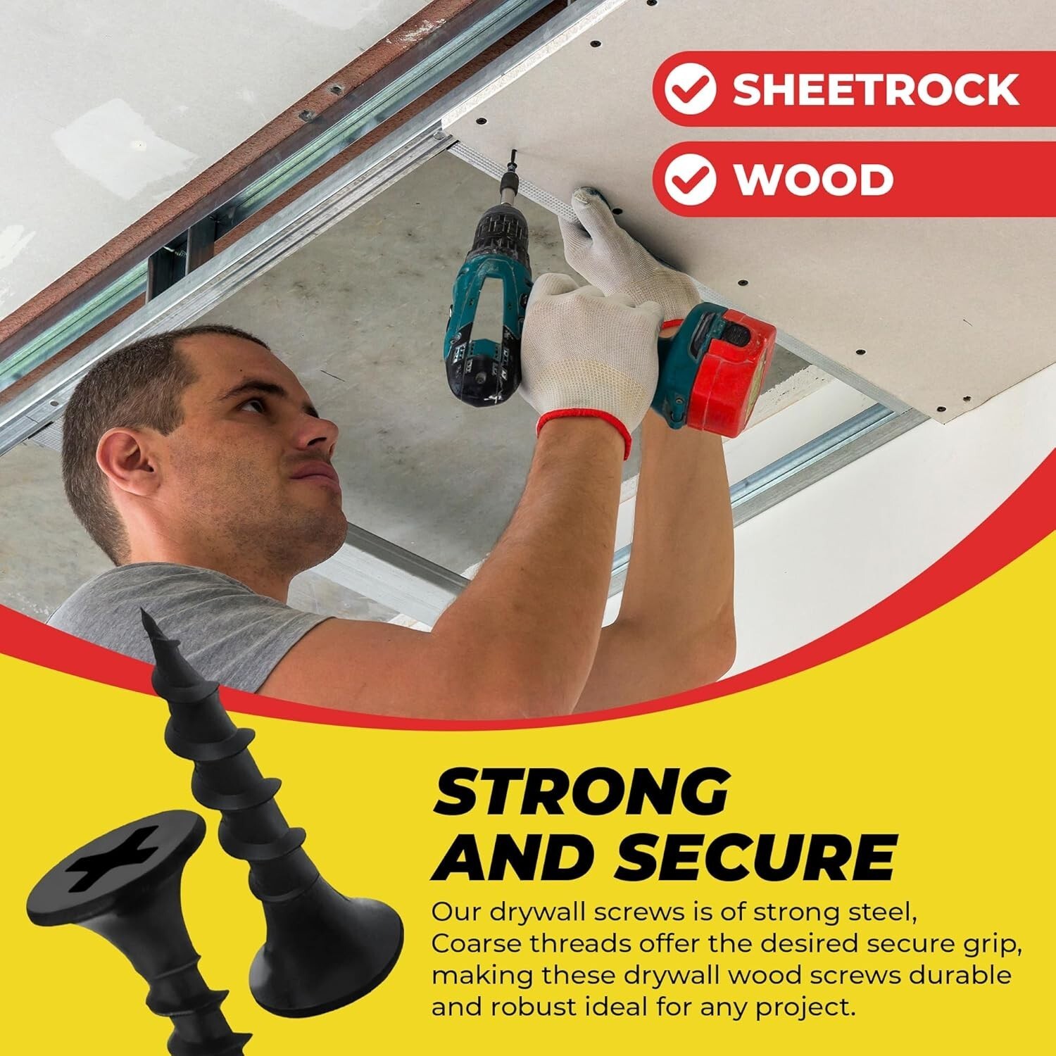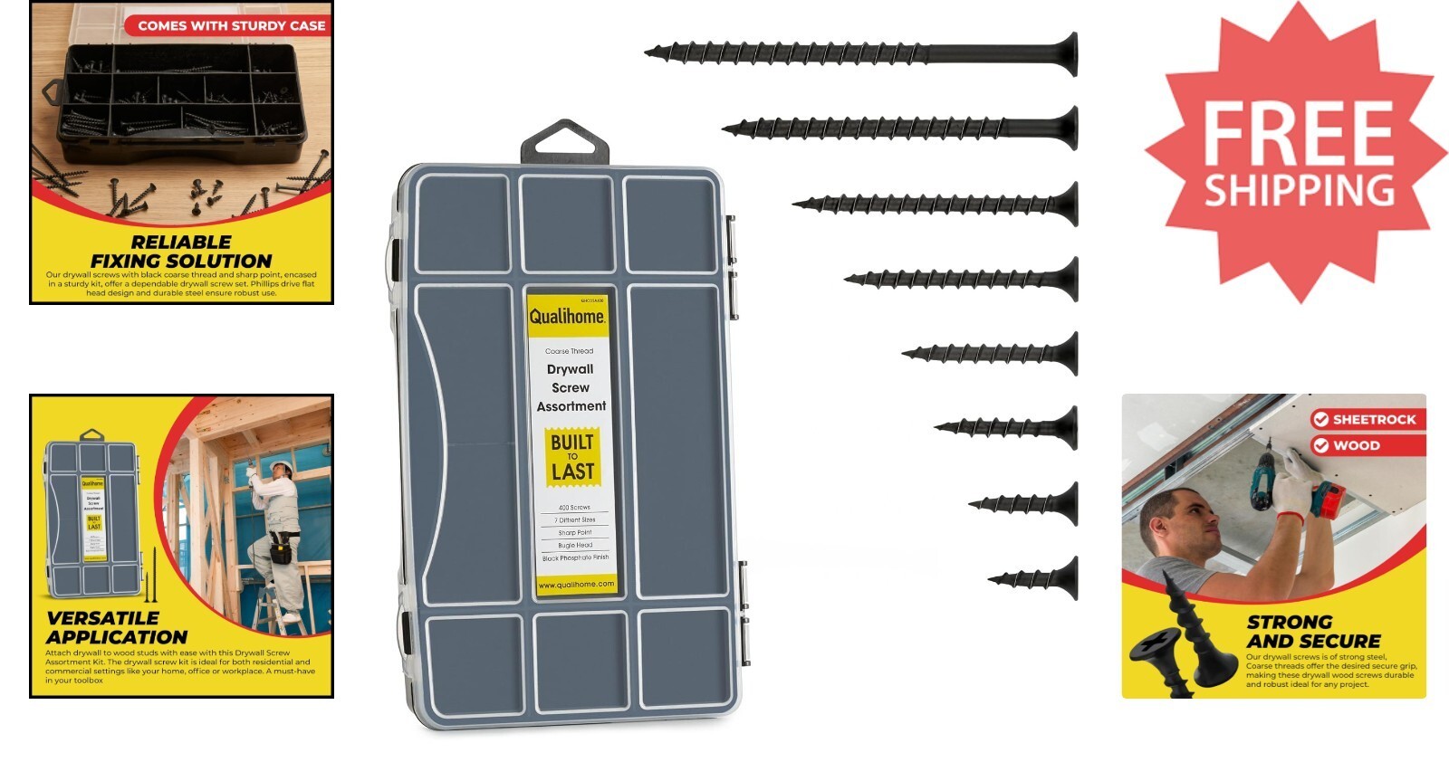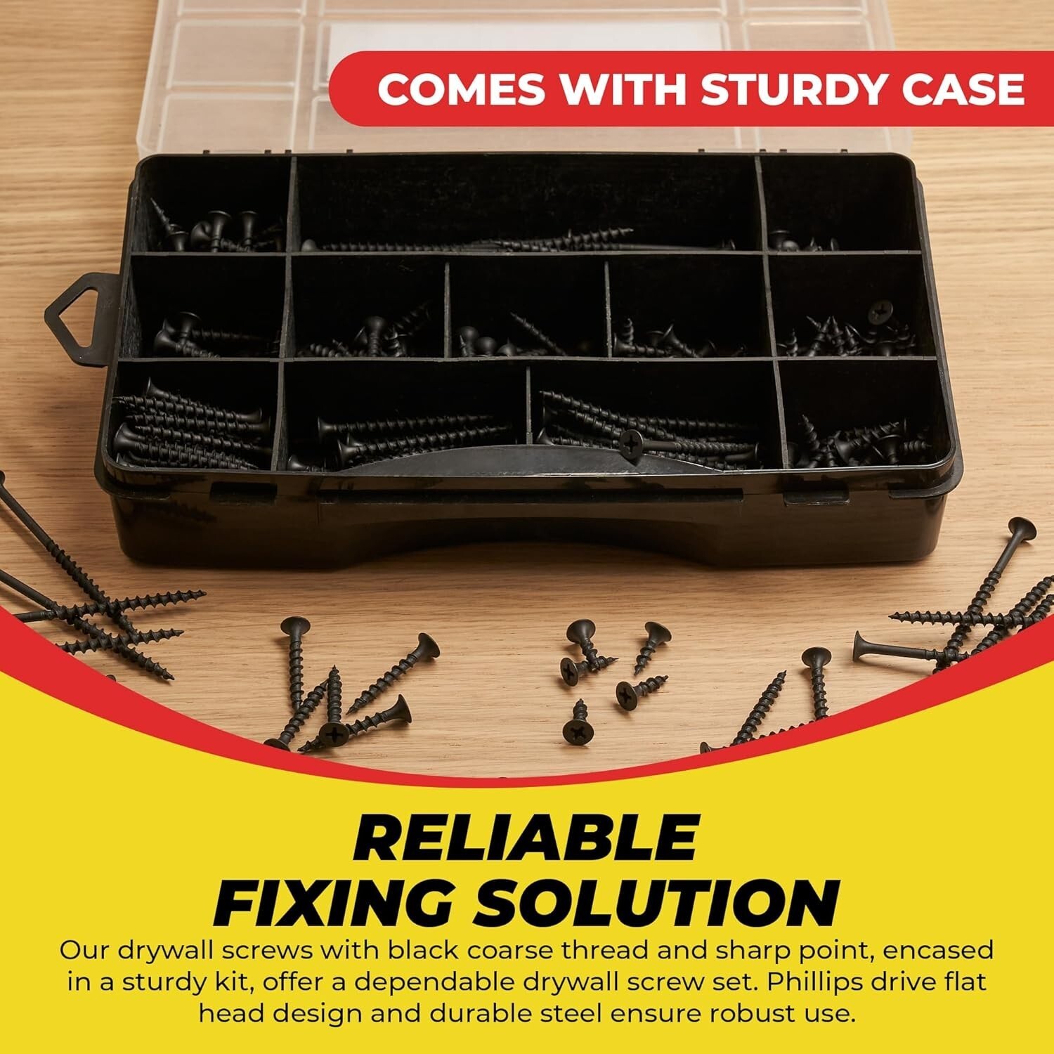 This Drywall Screw Assortment Kit is your go-to solution for quick, secure drywall installation. Suitable for residential and commercial projects, it features seven sizes from 5/8" to 3", including the popular 1" screws. Crafted with durable steel and coated in black, these screws offer a reliable, heavy-duty performance with coarse threads and sharp points that effortlessly pierce drywall and grip wood studs. The Phillips flat-head design ensures ease of driving, making this kit an essential addition to any toolbox. Trusted by professionals and DIYers alike for its strength and versatility.