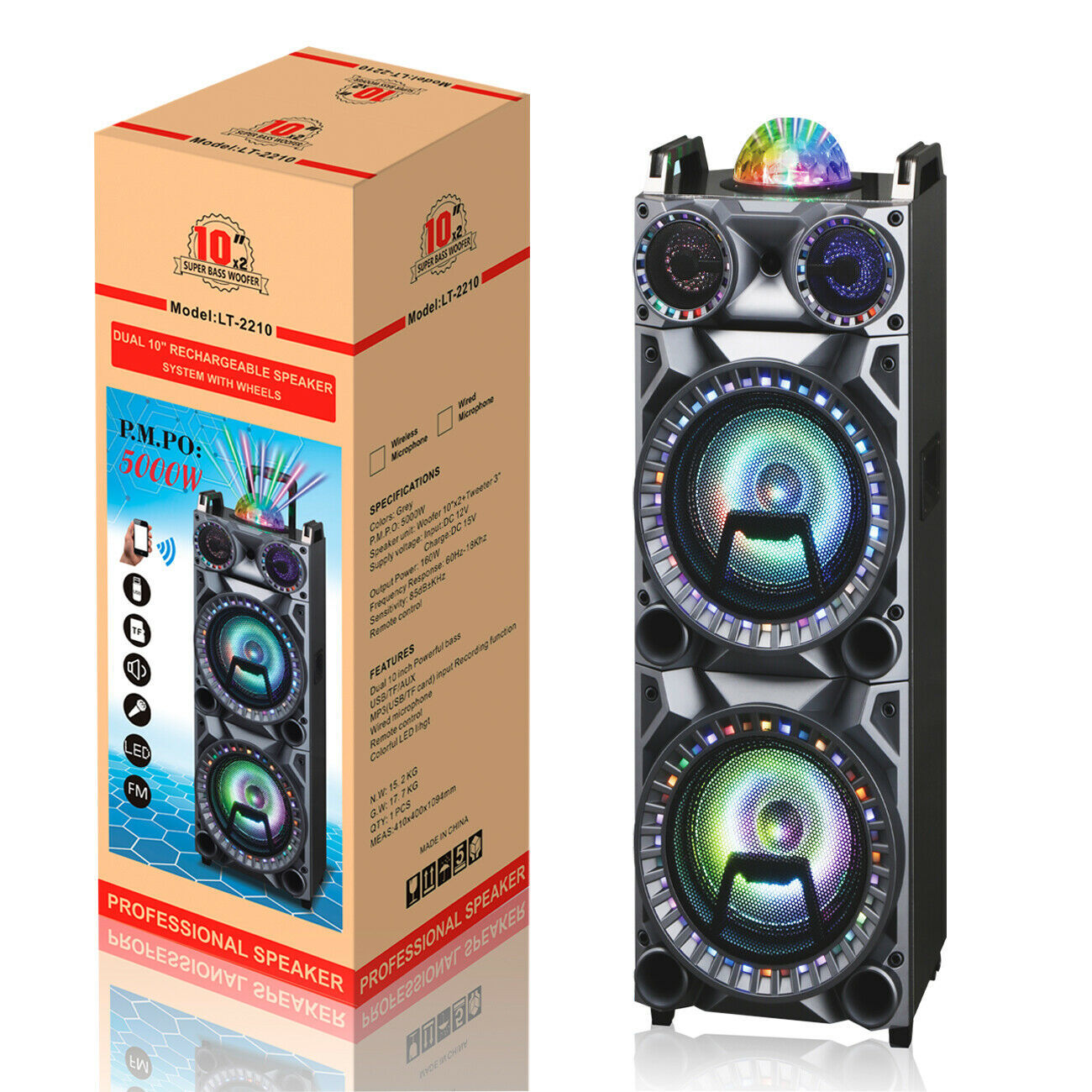 - Dual 10" Rechargeable Speaker System with Wheel LED Lights Wireless Mic & Remote