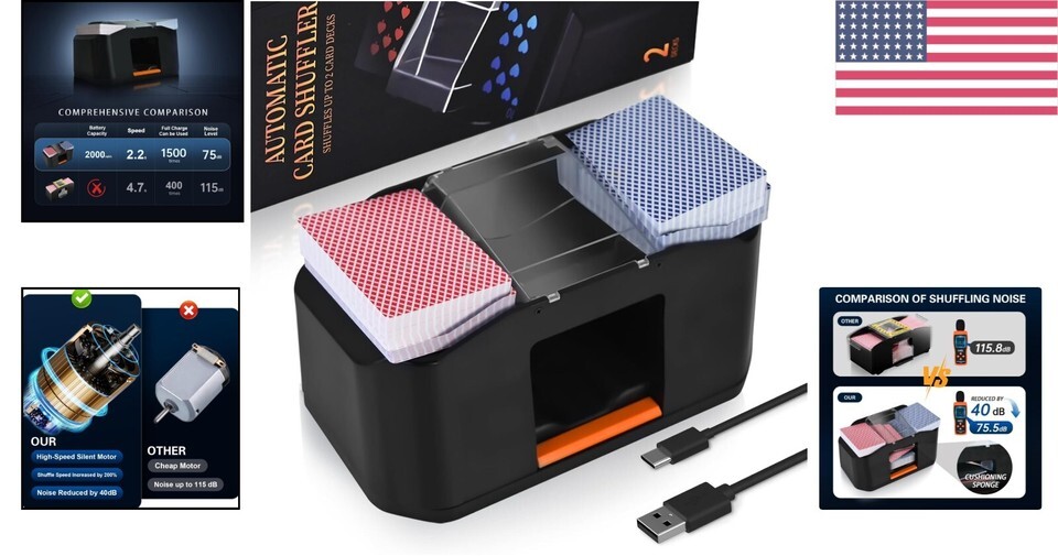 Dual-Deck Card Shuffler with Rechargeable 2000mAh Battery - For All Card Games ? ? ? ? ? ? ? ? ? ? ? ? ? ? ? ? Dual-Deck Card Shuffler with Rechargeable 2000mAh Battery Transform your game nights into an effortless experience with our Dual-Deck Card Shuffler. Compatible with all your favorite card games, this shuffler is engineered for efficiency and quiet operation, ensuring that you and your guests can focus on what truly matters: the game! Features: Built-in 2000mAh Rechargeable Battery: Enjoy up to 2000 shuffles on a single charge, lasting over a week of game nights. High-Speed Silent Motor: Shuffle 1-2 decks of cards with a single push of a button, completing in mere seconds. Quieter Operation: Reduced noise by 40 dB for a distraction-free gaming environment, so you can immerse yourself in the fun. Versatile Compatibility: Perfect for standard cards, Uno, Texas Hold'em poker, Blackjack, Phase10, and more. Returns/Replacement Service: A 180-day no-questions-asked replacement or refund service for complete peace of mind. Benefits: Seamless shuffling enhances gameplay and minimizes interruptions. Rechargeable convenience allows for carefree enjoyment without the need for constant battery replacement. Designed for quiet operation, ensuring that your gatherings remain enjoyable and free from annoying sounds. Perfectly suited for a myriad of card games, making it a versatile addition to your game night arsenal. Why Choose Our Dual-Deck Card Shuffler? Why settle for manual shuffling when you can ensure the randomness and excitement of the game with our advanced Dual-Deck Card Shuffler? Engineered not just for performance but also with your enjoyment in mind, it is the ultimate tool for any card enthusiast. With its high-capacity rechargeable battery, powerful yet silent motor, and compatibility with a wide range of games, you can elevate your game nights in style. Don?t let shuffling take away from the fun. Invest in your gaming experience and make your next game night unforgettable with our exceptional card shuffler today! Shipping Free Fast Shipping - We offer free shipping to most of the USA with a normal delivery time of 3-7 days. However, due to the current situation, additional delivery time (up to 3 weeks) may be required for some items. Alternative Carriers - We may use alternative carriers (e.g. USPS, FedEx, UPS, etc.) to ensure your package arrives safely and on time. Due to the use of multiple carriers, we are unable to provide a tracking number automatically. Handling Time - Orders are processed and shipped within 1-2 business days of receiving cleared payment. Shipping Restrictions - Shipping to Alaska, Hawaii, Puerto Rico, Guam, and other US territories may incur shipping charges or delivery restrictions. Please contact us before ordering, or your order can be refunded/cancelled. State Restrictions - There may be restrictions based on your state of purchase. For example, certain items may not be shipped to California due to state regulations. Contact for Tracking Updates - If you require tracking updates or have any concerns about the delivery of your order, please feel free to contact us, and we will be happy to assist you. Return 30-Day Hassle-Free Returns - We want you to be completely satisfied with your purchase. If you are not, you can return the item within 30 days of receiving it for a full refund or exchange. Easy Return Process - To start a return, simply contact us and we will provide you with a prepaid return shipping label and detailed instructions. Restocking Fee - There are no restocking fees for returns. However, the buyer is responsible for return shipping costs if the return is not due to a seller's error. Refund Processing Time - Refunds will be processed within 5 business days of receiving the returned item in its original condition. Payment We accept all major credit cards, PayPal, and Apple Pay for your convenience. Your payment information is secure and encrypted to ensure a safe and seamless transaction. Please complete your payment within 3 days of purchase to avoid any delays in shipping. Feedback Your feedback is extremely important to us. We strive to provide the best products and customer service possible. If you are satisfied with your purchase, please take a moment to leave us a positive review. If you have any concerns or issues with your order, please contact us before leaving negative feedback. We are committed to resolving any problems and ensuring your satisfaction. Contact Us If you have any questions or concerns, please feel free to reach out to our customer support team. You can contact us through the messaging system. We are available Monday to Friday, 9:00 am to 5:00 pm EST, and we will do our best to respond to your inquiry within 24 hours. Buy it now and enjoy a pleasant shopping experience! Country/Region of Manufacture: Electric Card Shuffler