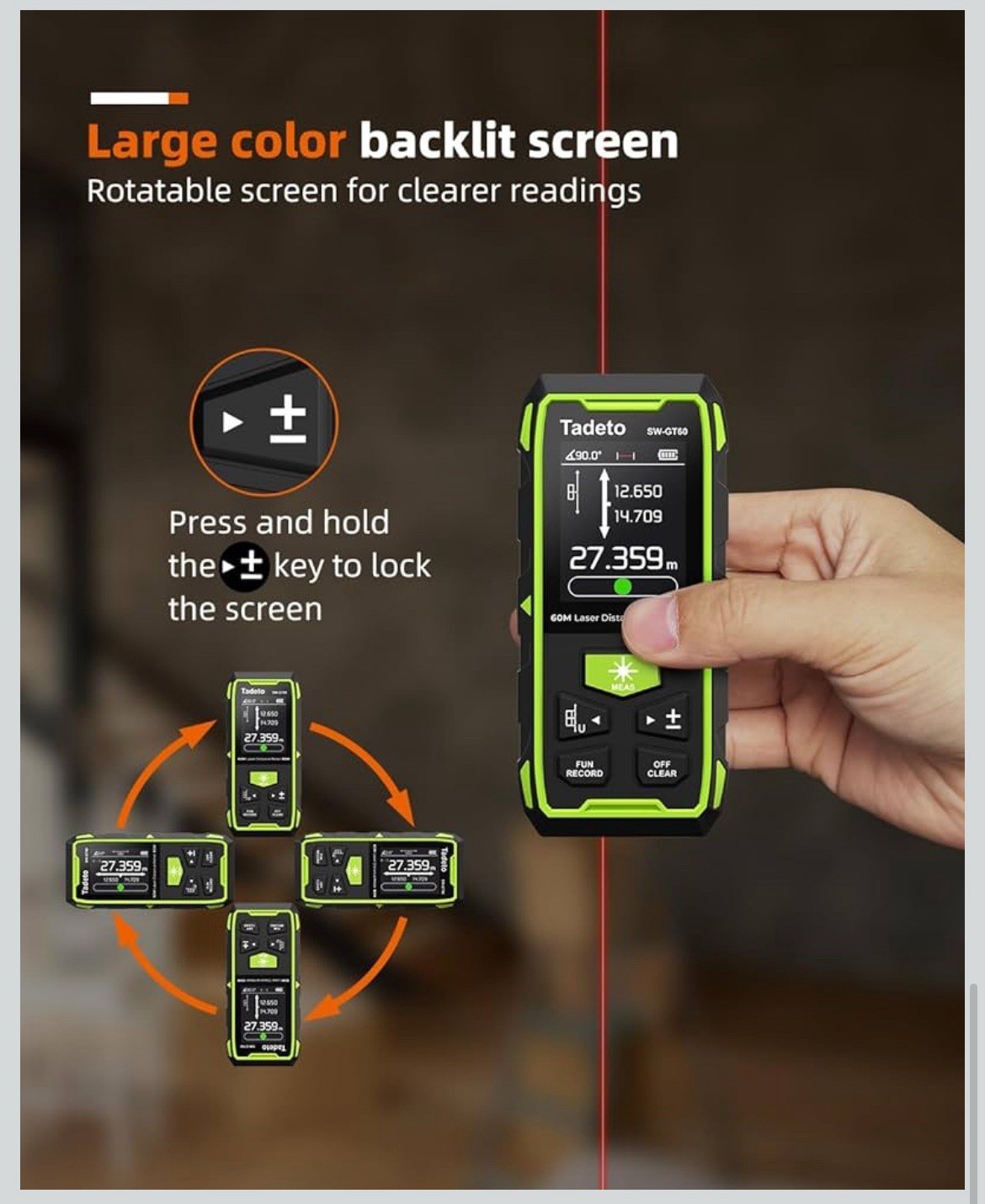 Multiple Function: Compared with laser tape measure, our dual distance meter provides nine measurement mode, Distance/Area/Volume/Angle/Wall/indirect Measurement etc. Through these diverse measurement modes, our products can meet a variety of different measurement needs, whether it is simple length measurement or complex volume calculation, they can be easily handled. This laser measurement tool supports the automatic rotating screen.You can lock the screen's orientation so it remains fixed