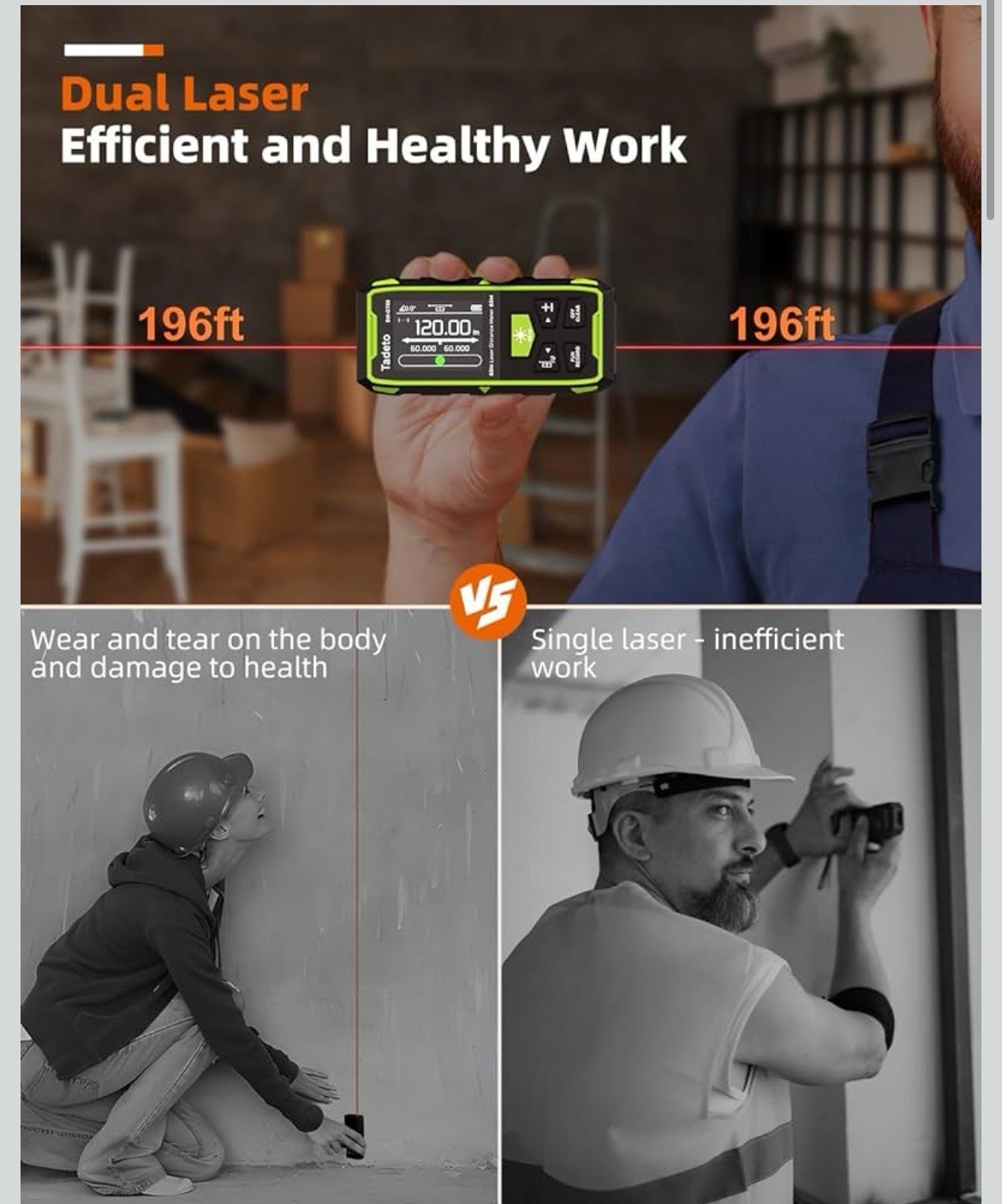 New Design: This bilateral laser measuring tool can measure in two directions simultaneously, which can greatly improve measurement efficiency and accuracy with reliable measurement results.?Muti-Benchmark Measurement Setting) You do not need to move the measuring instrument multiple times to measure different location, thus saving time and energy. MAX Measurement Distance up to 393FT/120M. It is recommended to use this product indoors