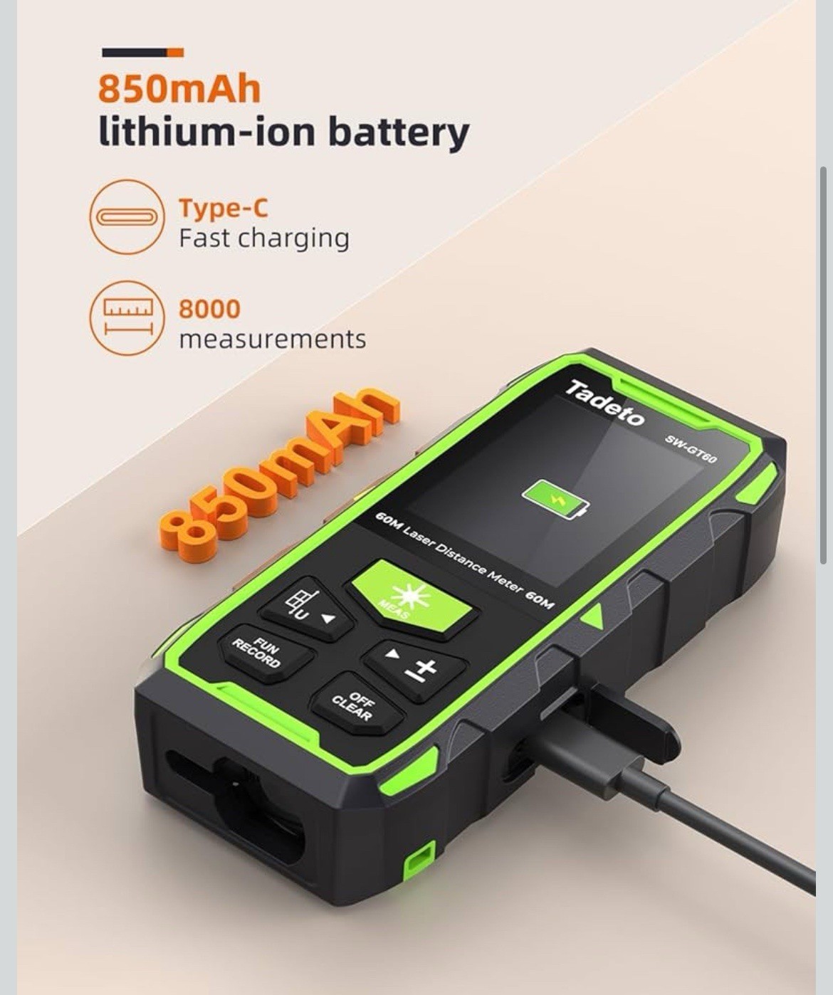 Rechargeability: The bilateral laser measure tool is equipped with 850mAh rechargeable battery and Type-C charge port. One full charge with the tool allows for 8000+ measurements so that you can use it all day long without worrying about runing out of power. Our laser distance meters adopt a unique shell design,the body is wrapped in excellent quality material, which is anti-vibration, anti-slip and anti-fall. This design can provide users with a better grip and comfort