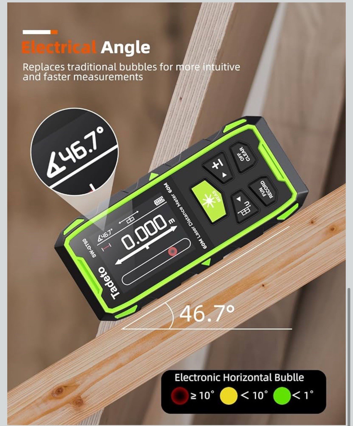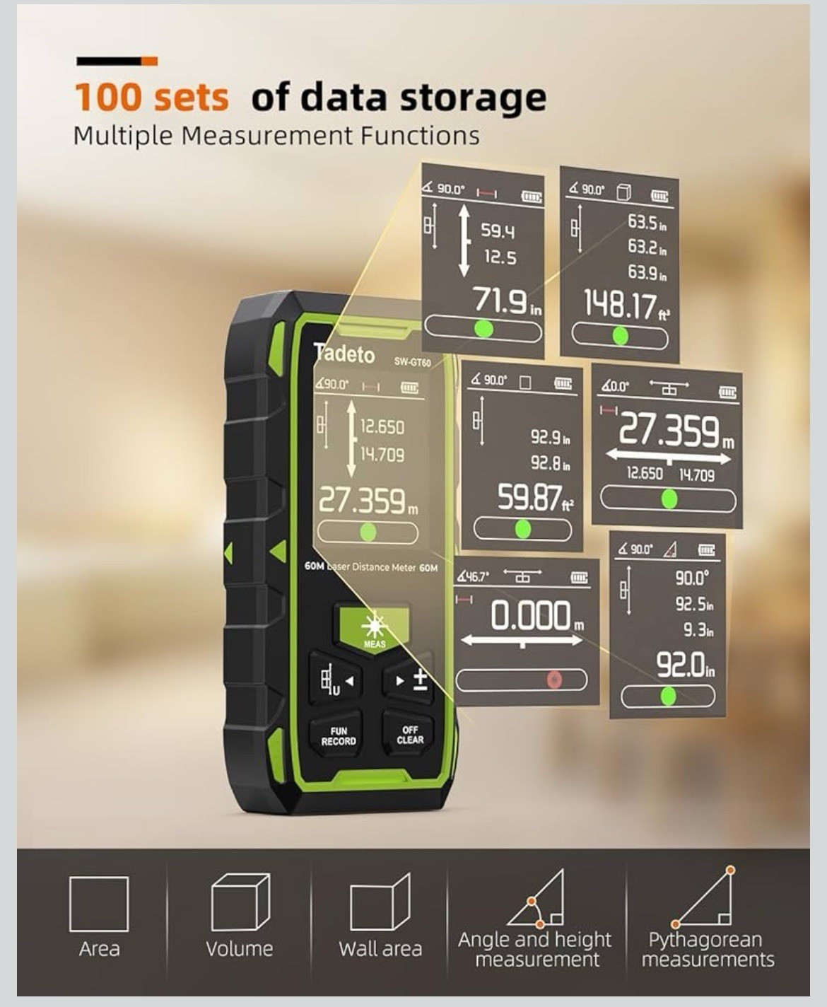LCD Display: This laser distance measuring tool equipped with larg LCD display and data record function. The high-definition backlit screen makes the display clearly visible and remains readable even in bright light conditions.Our products can store up to 100 sets of data. This means that users can save measurements data in the device for later viewing or processing! In addition, electronic angle function that can help you quickly determine the horizontal direction
