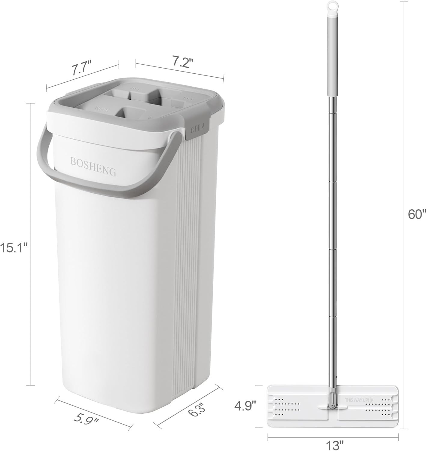 Experience effortless cleaning with our Dual-Side 2-Tank Bucket System, designed for efficient washing and drying. The split chambers allow you to wash your mop in one side and dry it in the other, preventing dirt and dust from spreading. The self-cleaning mop features a one-handed squeeze operation, making it easy and mess-free. Its 360 rotating rectangular head reaches every corner, while the adjustable stainless steel handle extends from 37 to 60 inches for ceiling, wall, and floor cleaning. Includes 2 reusable microfiber pads with strong water absorption for versatile wet and dry cleaning. Compact and lightweight, the bucket measures approximately 7.68x7.28x15.16 inches, making storage simple and convenient.