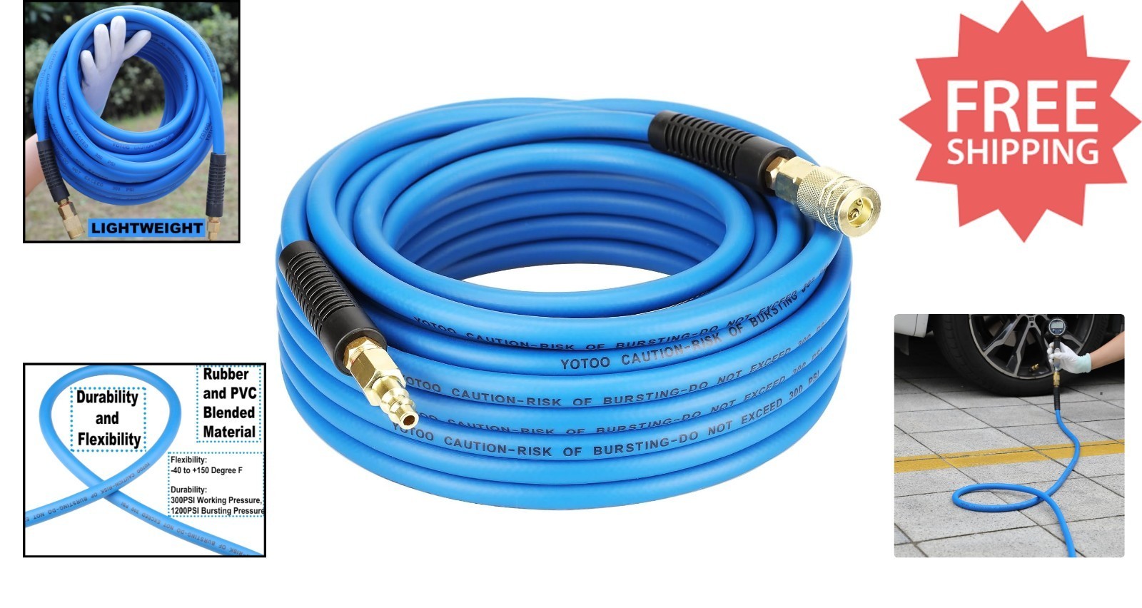 Experience durability and flexibility with our heavy-duty, lightweight hybrid air hose made from blended rubber and PVC. Designed for all-weather use, it features abrasion resistance to withstand tough conditions. Ready to connect directly to your air compressor and tools, it comes equipped with 1/4? industrial NPT fittings and a quick coupler?no additional fittings needed. Both ends are fitted with bend restrictors to prevent kinking and extend the hose?s lifespan. Measuring 1/4 inch inner diameter and 50 feet long, it offers a maximum working pressure of 300 PSI and a bursting strength of 1200 PSI. Backed by a two- limited , this hose is your reliable choice for demanding air applications. To ensure fast and reliable delivery, we work with multiple fulfillment partners and suppliers. Depending on availability and location, your order may ship from different warehouses or arrive in packaging that varies from item to item. Tracking details are typically provided shortly after shipment, and customer satisfaction remains our top priority. Please note that due to carrier policies and regional regulations, certain items may not be eligible for delivery to specific states or territories.