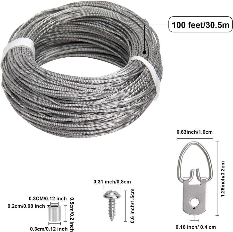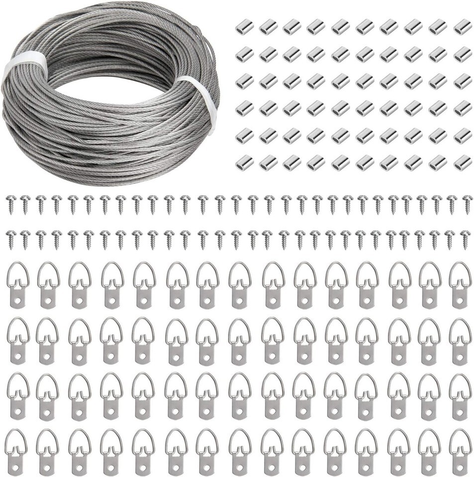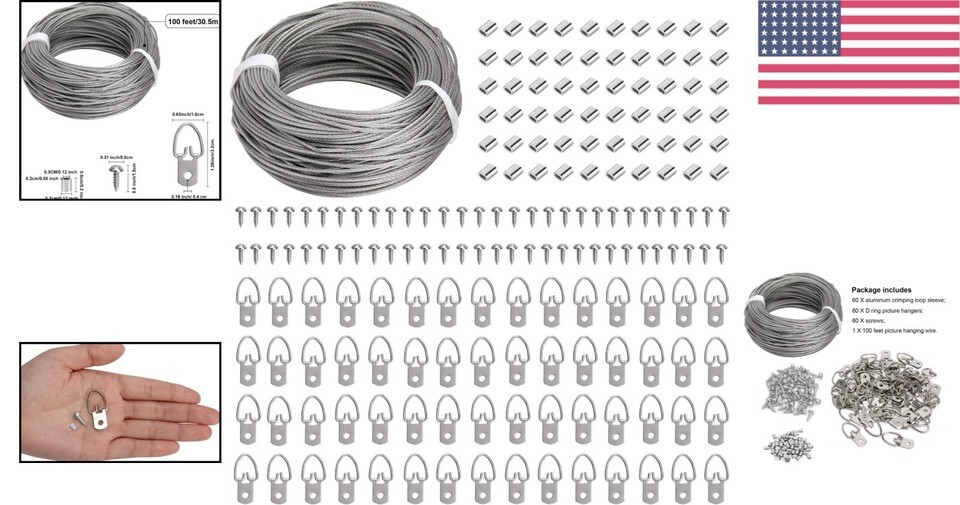 Durable 100ft Picture Hanging Wire Set with 60 D-Ring Hangers Screws Included