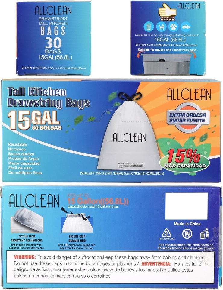 Includes 30 translucent bags with black drawstrings, measuring 2 ft by 2.5 ft. Ideal for reducing trash time and maintaining hygiene.