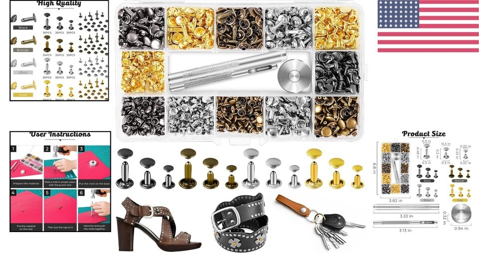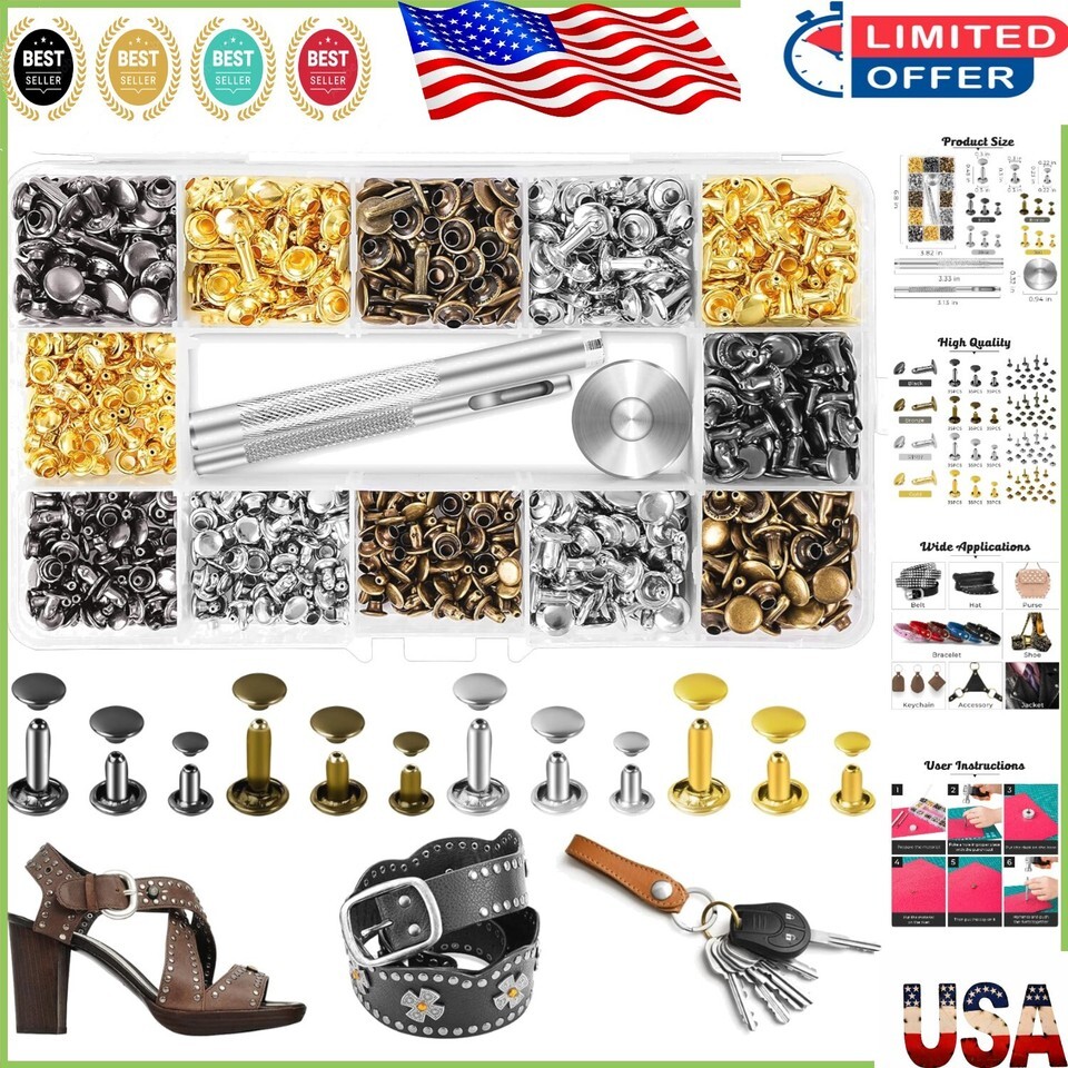 420 Sets of Rivets: This comprehensive leather rivet set includes 420 double cap brass rivets in four exquisite colors and three versatile sizes, ensuring you're fully equipped for all your DIY crafting needs.