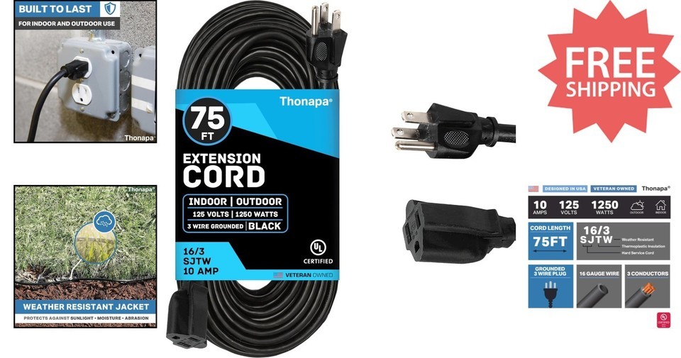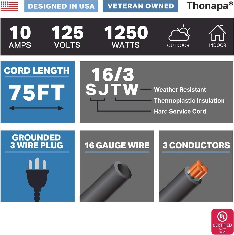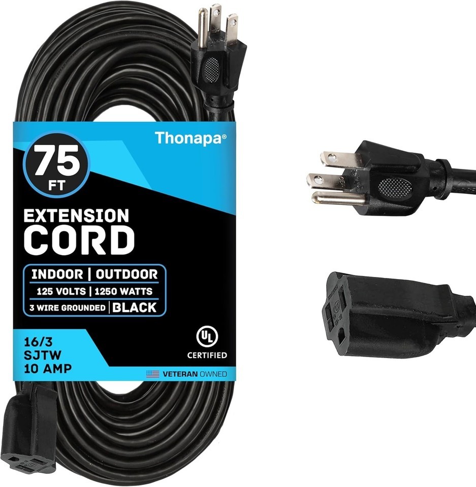 Experience reliable power with the Thonapa 75-foot outdoor extension cord, expertly crafted with pure copper wiring and a durable vinyl jacket that resists water, snow, heat, and chemical exposure. Designed for both indoor and outdoor use, it?s perfect for powering leaf blowers, lawnmowers, landscaping tools, outdoor lights, and household appliances. Features nickel-coated blades for added durability, corrosion resistance, and slip resistance. certified and built to withstand extreme temperatures from -40F to +140F, this heavy-duty, 16-gauge, 3-prong grounded extension cord delivers safety and performance. As a U.S. Veteran-owned company, we prioritize quality and customer satisfaction. To ensure fast and reliable delivery, we work with multiple fulfillment partners and suppliers. Depending on availability and location, your order may ship from different warehouses or arrive in packaging that varies from item to item. Tracking details are typically provided shortly after shipment, and customer satisfaction remains our top priority. Please note that due to carrier policies and regional regulations, certain items may not be eligible for delivery to specific states or territories.
