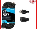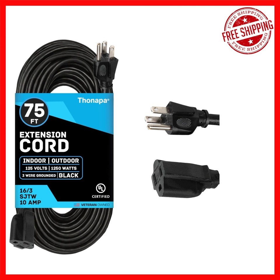 - Durable 75 ft Outdoor Extension Cord - Black 3-Prong, Weatherproof & Listed