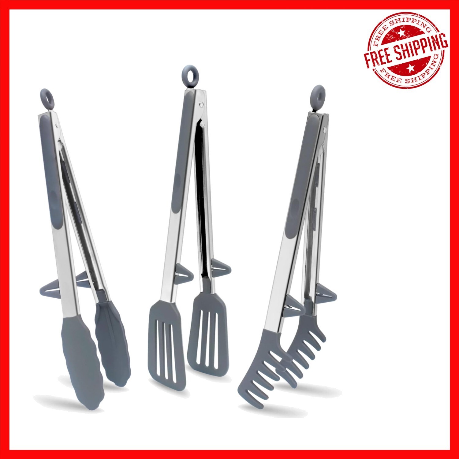 Durable Grey Silicone Tongs Set with Stainless Steel - Heat Resistant & Safe