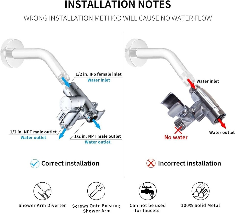 Compatibility: Designed with one 1/2" IPS water inlet and two 1/2" NPT water outlets, ensuring seamless integration with standard shower heads and hoses.
