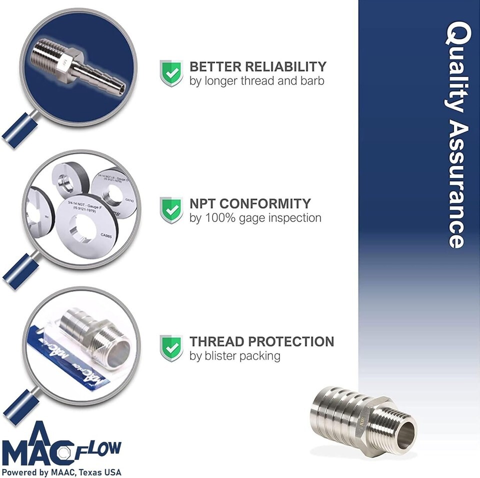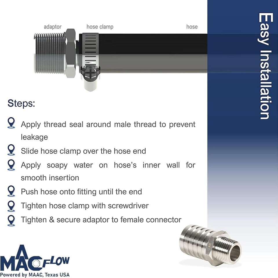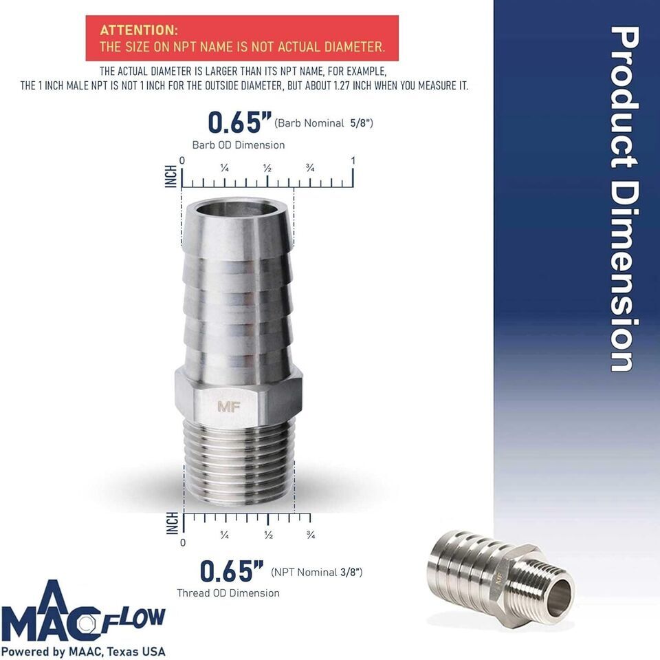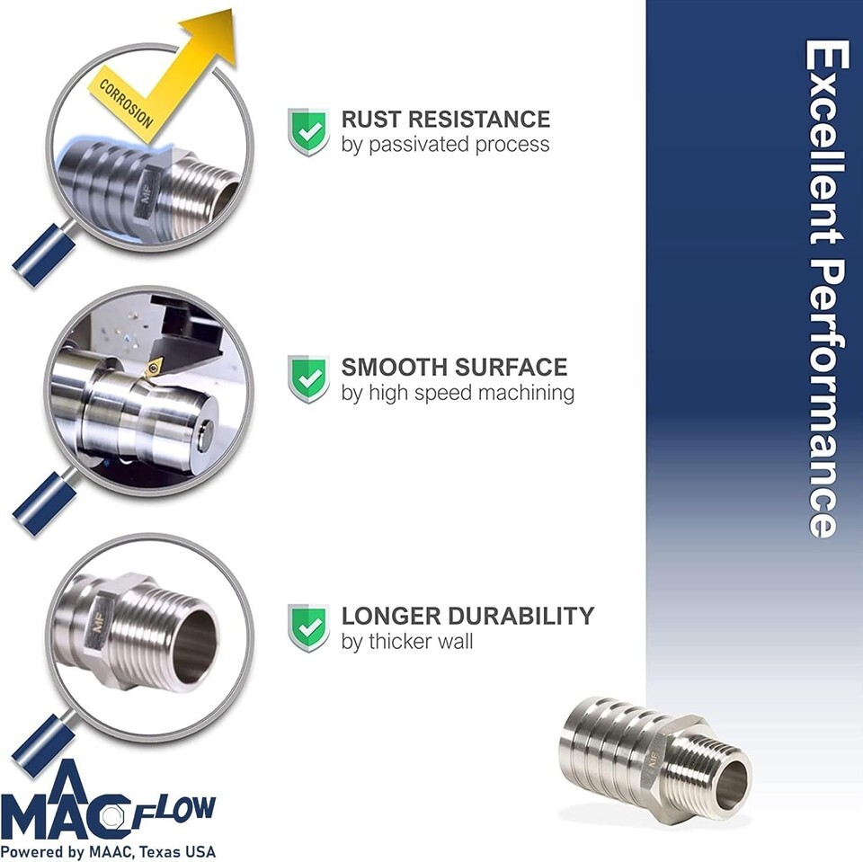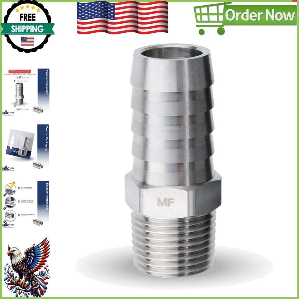 Durable Stainless Steel 5/8" Barb to 3/8" NPT Hose Fitting Connector - 1 Pack ? ? ? ? ? ? ? ? ? ? ? ? ? ? ? ? ? ? Durable Stainless Steel Hose Fitting Connector 5/8" Barb to 3/8" NPT Pack of 1 Features: Advanced passivation process enhances protection against rust and corrosion. High-speed machining ensures precise dimensions and a superior surface finish. Designed with a thicker wall, longer threads, and robust barbs for enhanced durability and reliability. Guaranteed 100% NPT gauge inspection for perfect thread conformity. Clamshell packaging designed to protect the fitting and threads during transit. Benefits: Considerably extends the lifespan of the product, ensuring long-term use. Precision engineering results in leak-proof connections and enhanced performance. Durable construction makes this connector ideal for heavy-duty applications. Protected packaging assures that you receive your connector in pristine condition. Suitable for automotive, plumbing, and various industrial applications. Why choose our Stainless Steel Hose Fitting Connector? Elevate your plumbing and connection projects with our Durable Stainless Steel 5/8" Barb to 3/8" NPT Hose Fitting Connector. Crafted to perfection, this fitting undergoes an advanced passivation process that bolsters its resistance to rust and corrosion, ultimately prolonging its life and maintaining its performance. With exceptional machining and robust design, this fitting guarantees a reliable connection and withstands the rigors of daily use. Experience peace of mind with our 100% NPT gauge inspection that ensures your fitting is up to par. This product is not just another fitting; it?s a commitment to quality and durability in all your projects. Choose reliability, choose excellence ? order your Stainless Steel Hose Fitting Connector today! Shipping Free Fast Shipping - We offer free shipping to most of the USA with a normal delivery time of 3-7 days. However, due to the current situation, additional delivery time (up to 3 weeks) may be required for some items. Alternative Carriers - We may use alternative carriers (e.g. USPS, FedEx, UPS, etc.) to ensure your package arrives safely and on time. Due to the use of multiple carriers, we are unable to provide a tracking number automatically. Handling Time - Orders are processed and shipped within 1-2 business days of receiving cleared payment. Shipping Restrictions - Shipping to Alaska, Hawaii, Puerto Rico, Guam, and other US territories may incur shipping charges or delivery restrictions. Please contact us before ordering, or your order can be refunded/cancelled. State Restrictions - There may be restrictions based on your state of purchase. For example, certain items may not be shipped to California due to state regulations. Contact for Tracking Updates - If you require tracking updates or have any concerns about the delivery of your order, please feel free to contact us, and we will be happy to assist you. Return 30-Day Hassle-Free Returns - We want you to be completely satisfied with your purchase. If you are not, you can return the item within 30 days of receiving it for a full refund or exchange. Easy Return Process - To start a return, simply contact us and we will provide you with a prepaid return shipping label and detailed instructions. Restocking Fee - There are no restocking fees for returns. However, the buyer is responsible for return shipping costs if the return is not due to a seller's error. Refund Processing Time - Refunds will be processed within 5 business days of receiving the returned item in its original condition. Payment We accept all major credit cards, PayPal, and Apple Pay for your convenience. Your payment information is secure and encrypted to ensure a safe and seamless transaction. Please complete your payment within 3 days of purchase to avoid any delays in shipping. Feedback Your feedback is extremely important to us. We strive to provide the best products and customer service possible. If you are satisfied with your purchase, please take a moment to leave us a positive review. If you have any concerns or issues with your order, please contact us before leaving negative feedback. We are committed to resolving any problems and ensuring your satisfaction. Contact Us If you have any questions or concerns, please feel free to reach out to our customer support team. You can contact us through the messaging system. We are available Monday to Friday, 9:00 am to 5:00 pm EST, and we will do our best to respond to your inquiry within 24 hours. Buy it now and enjoy a pleasant shopping experience! Manufacturer Part Number: Hose Fitting Adapter UPC: Not Set Surface Finish: Passivated Unit Quantity: 1 Placement on Vehicle: Hose Fitting Adapter Brand: Unbranded Warranty: Unspecified Length Performance Part: Yes Color: Silver Country/Region of Manufacture: Not Set Type: Barb Unit Type: oz Part Type: Not Set
