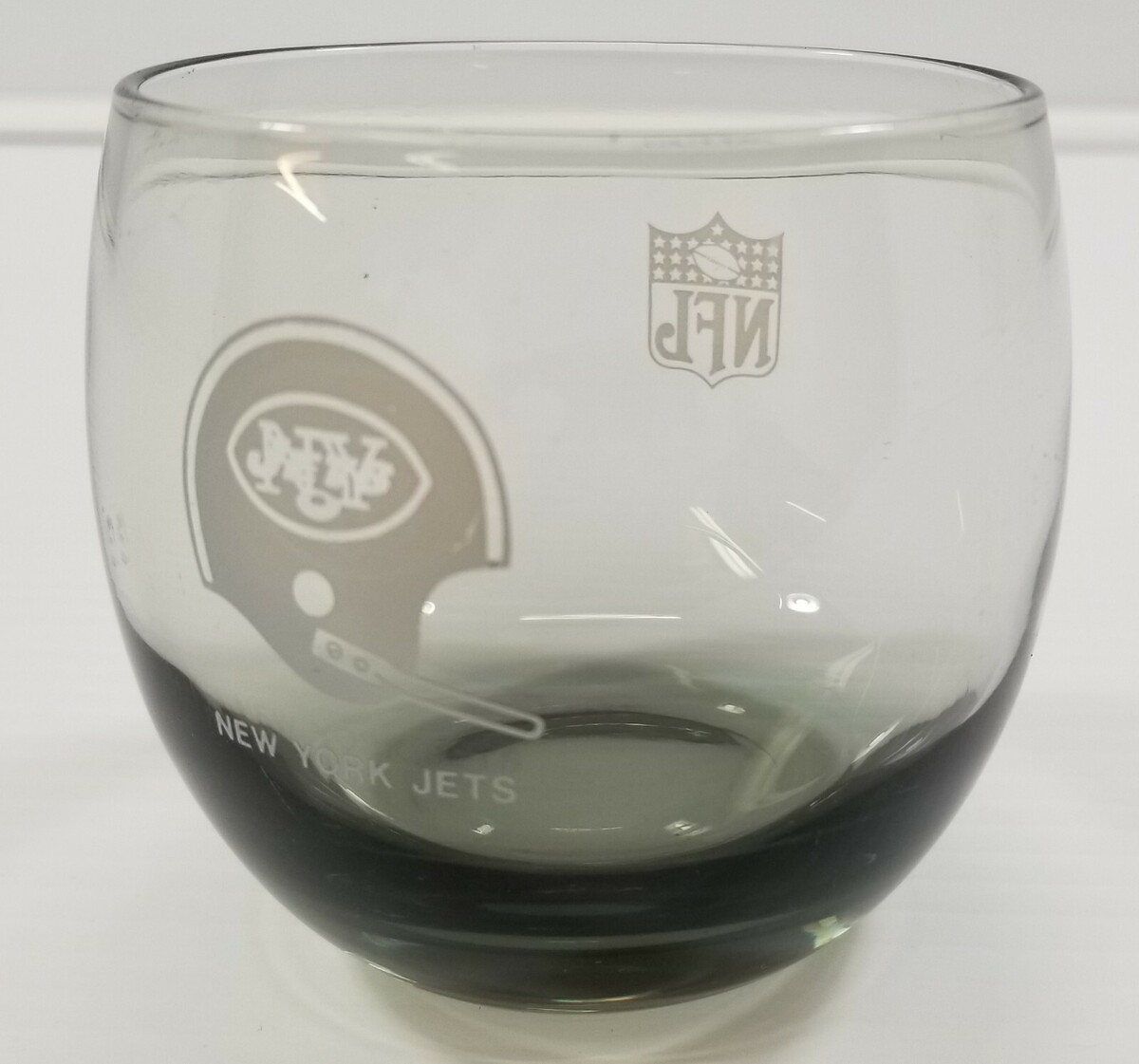New York Jets Tumbler NFL 1970?s Smoke Tinted Glass Glass measures about 2-1-/4" tall x 3-1/2" diameter Glass is in good, vintage, slightly used condition.